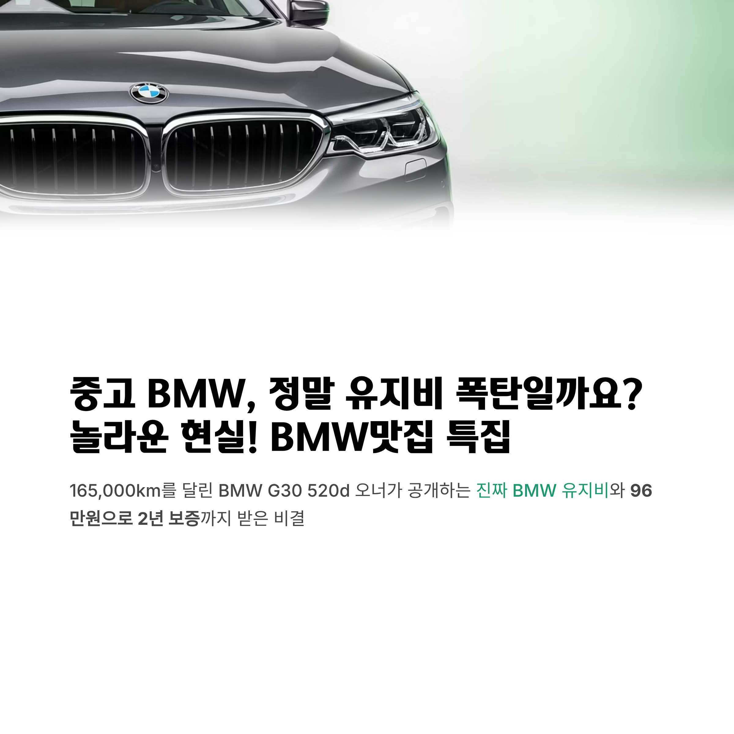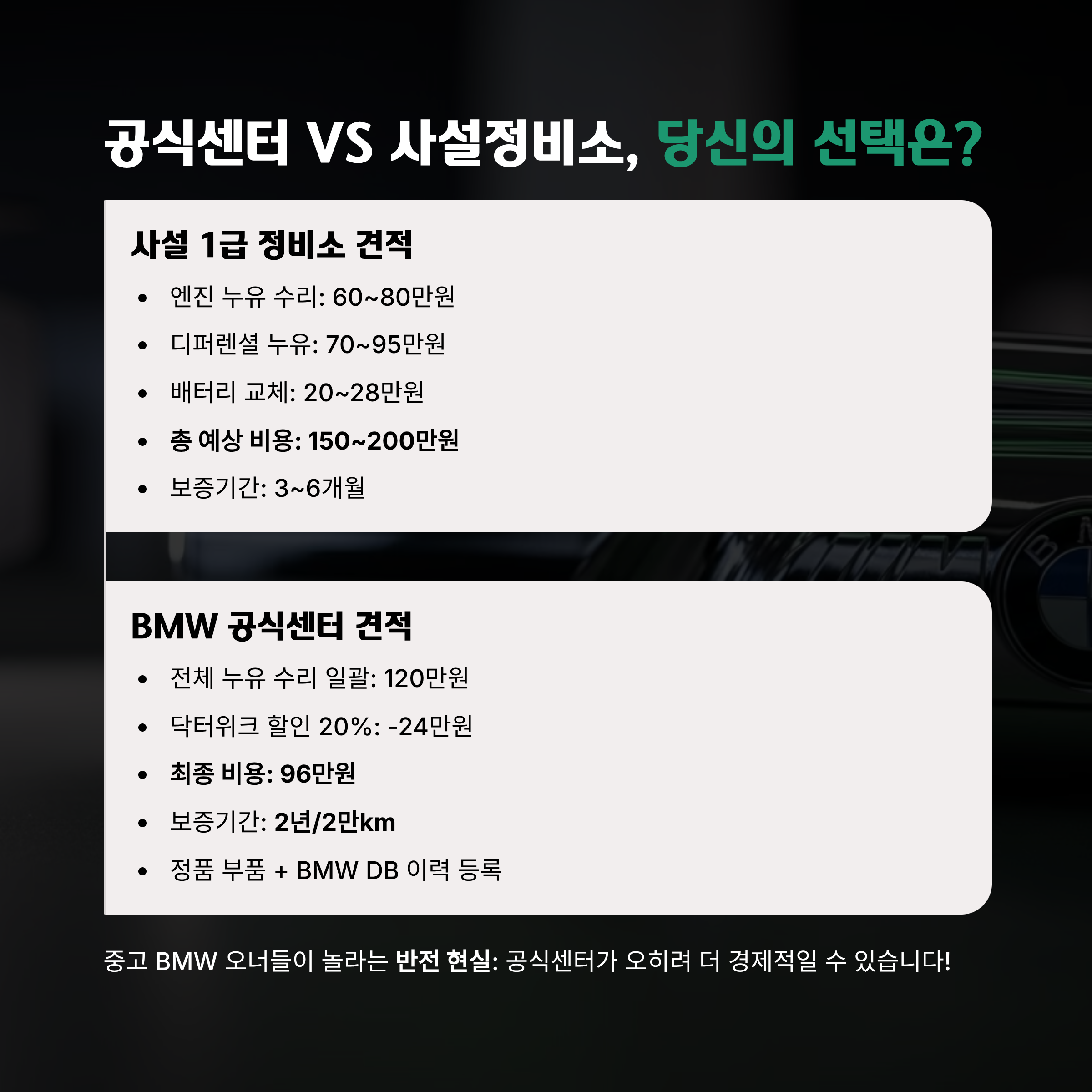결과적으로는 96만원 투자로 2년 보증까지 받는 대박 딜을 성사시켰습니다. 어떻게 이런 결과가 나왔는지, BMW 유지관리의 모든 것을 공유해드리겠습니다.