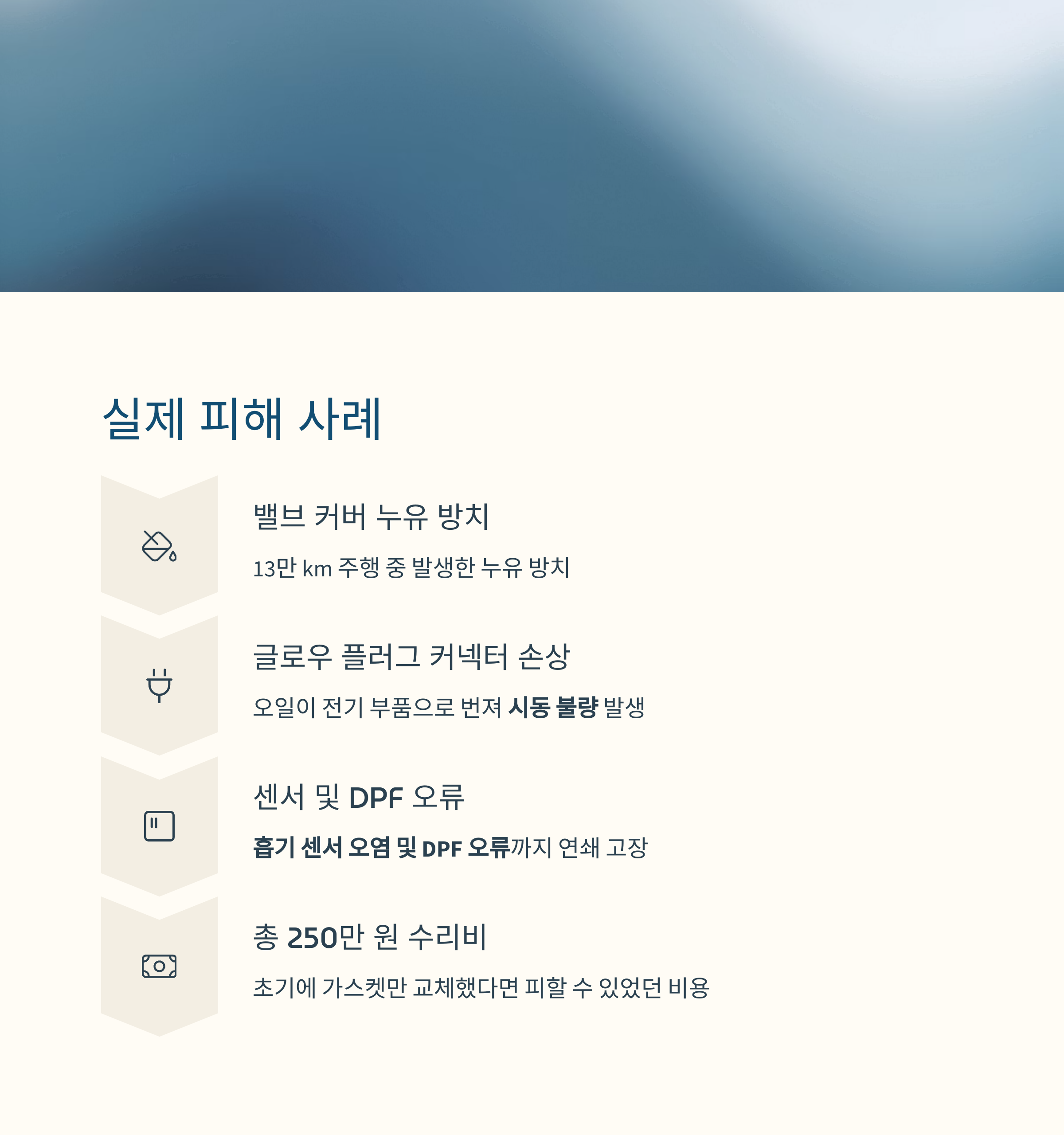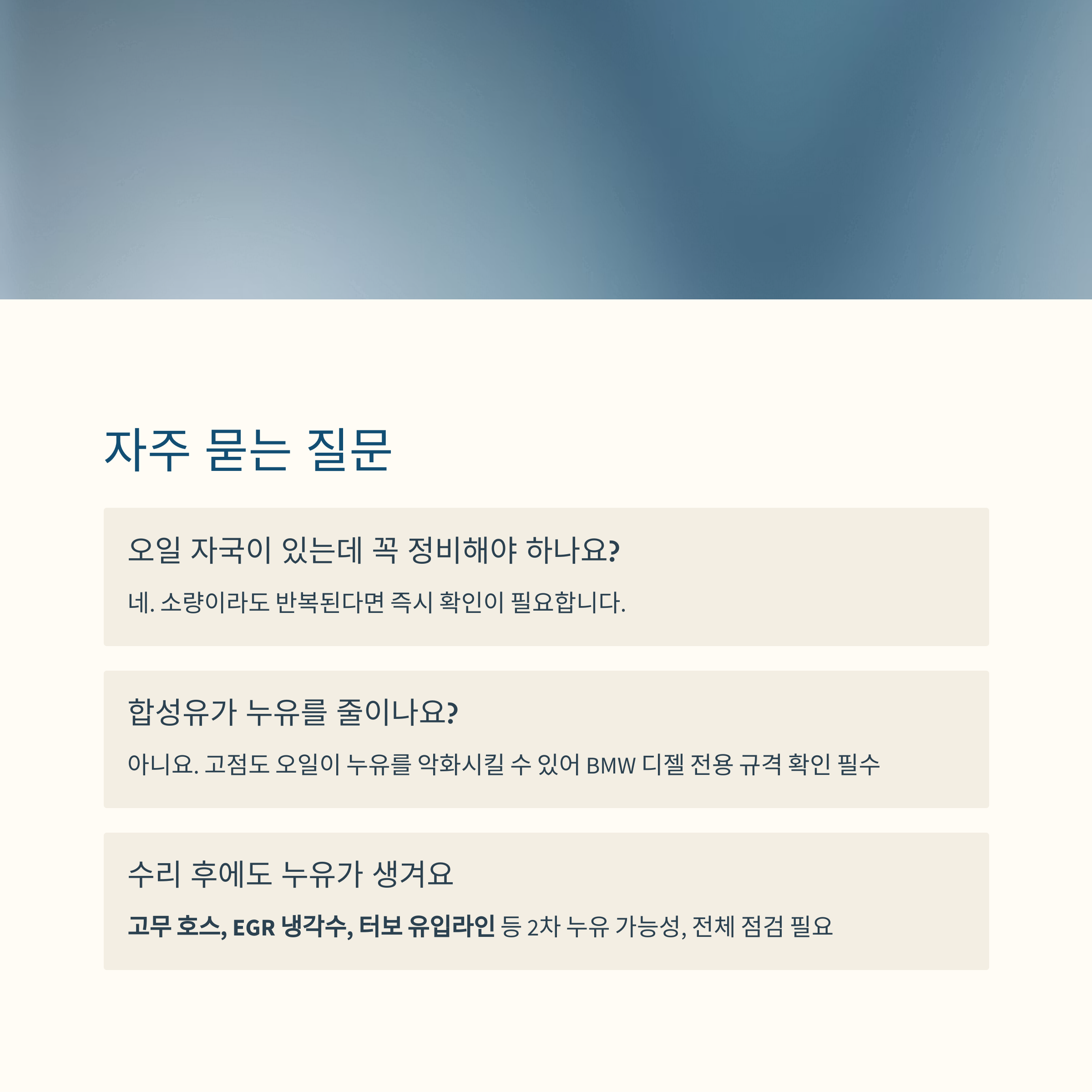 특히 오일 필터 하우징, 밸브 커버 가스켓, 터보라인에서의 누유가 빈번합니다