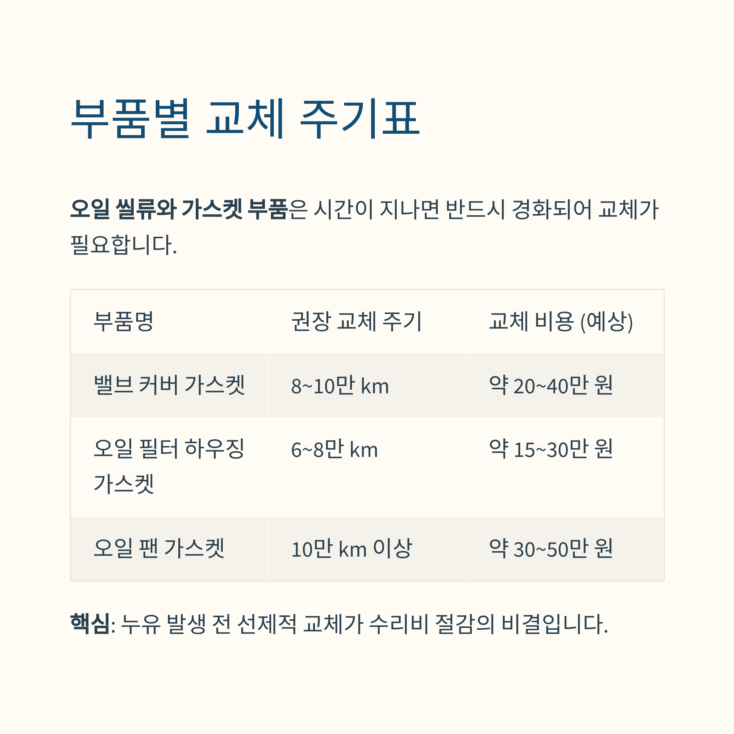 | 밸브 커버 가스켓 | 8~10만 km | 약 20~40만 원 |