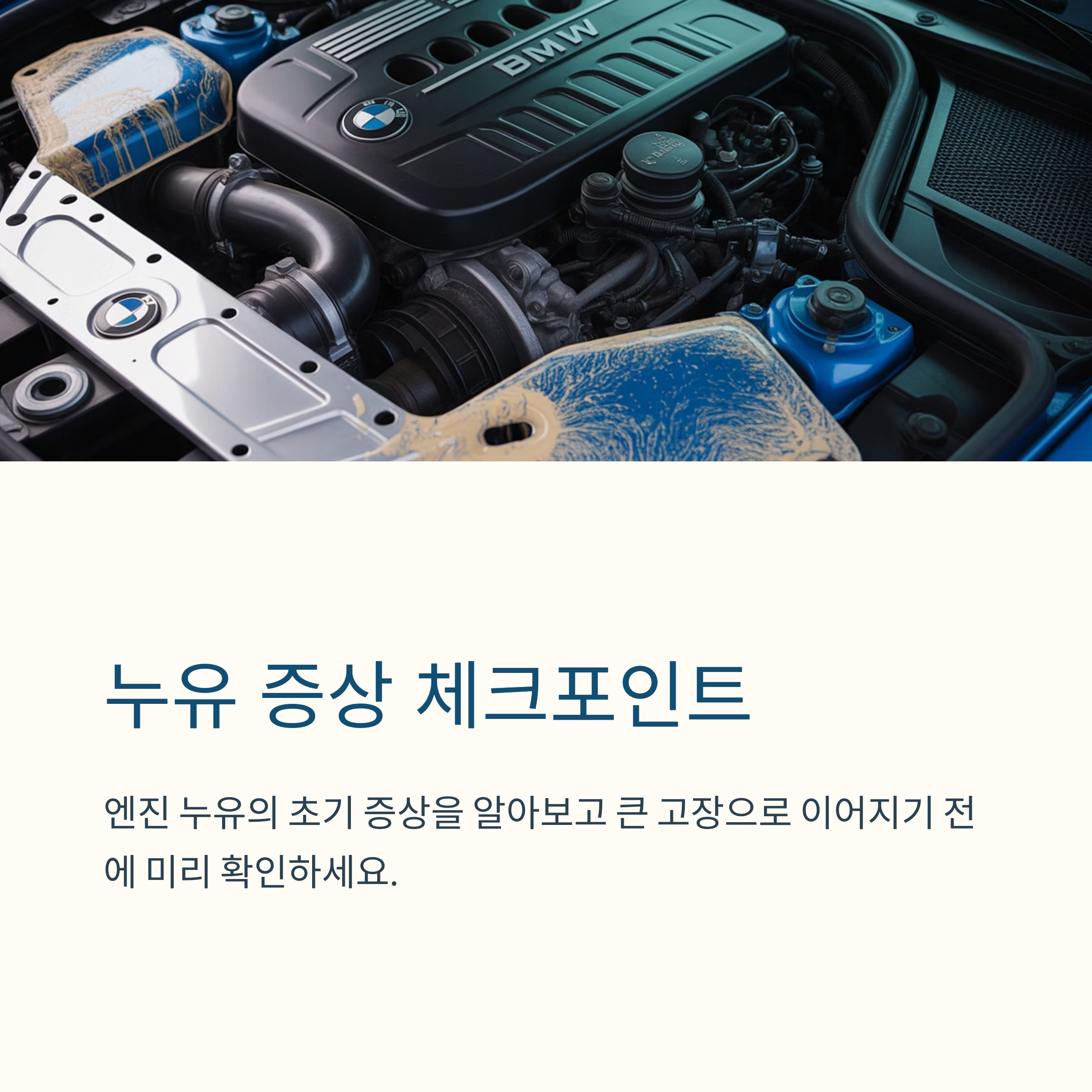 BMW 디젤 엔진은 고출력 고압 시스템을 갖춘 만큼, 열과 압력에 의한 누유가 자주 발생합니다