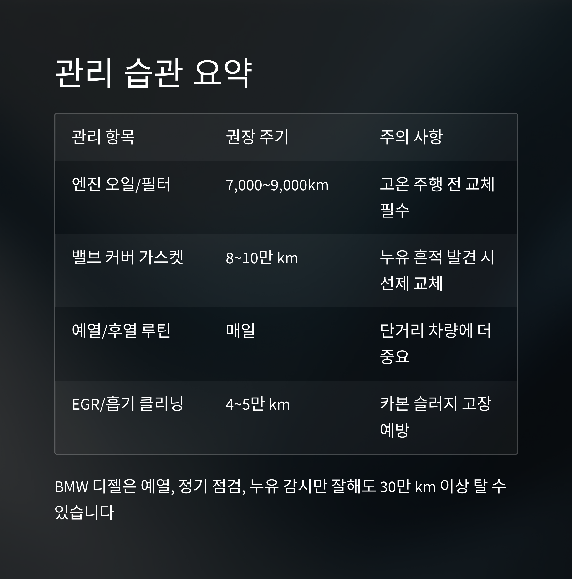 특히 EGR 밸브, 흡기 클리닝 등 카본 슬러지 관리 병행이 필수입니다