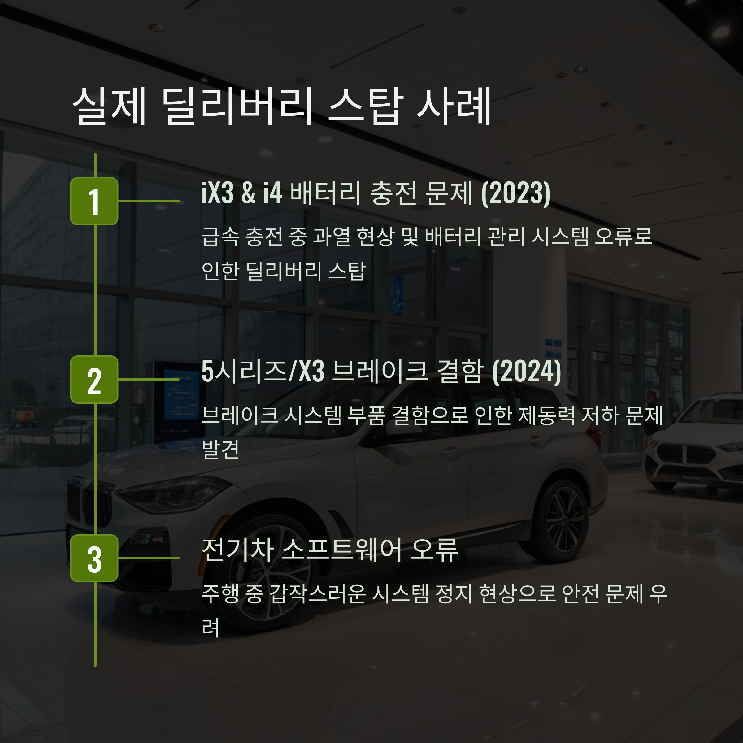 한국에서 발생한 BMW 딜리버리 스탑 사례는 다양합니다. 특히 2020년 이후 신차 출시가 활발해지면서 그에 따른 품질 이슈도 증가하는 추세입니다. 대표적인 사례로는 다음과 같습니다.