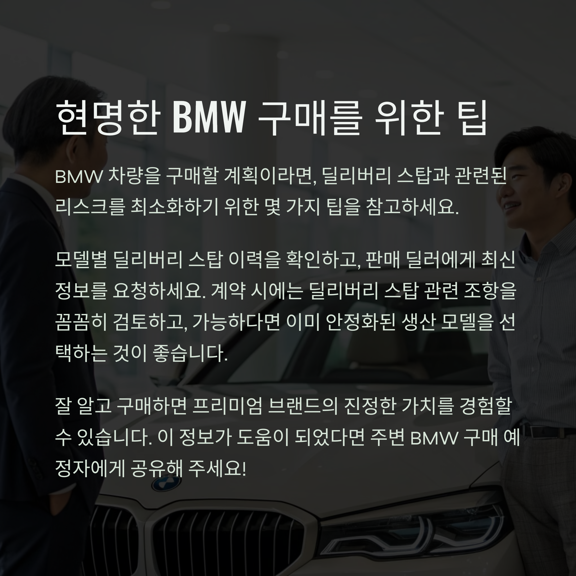 BMW 차량을 구매하고자 하는 소비자라면 다음과 같은 방법으로 딜리버리 스탑 리스크를 줄일 수 있습니다.