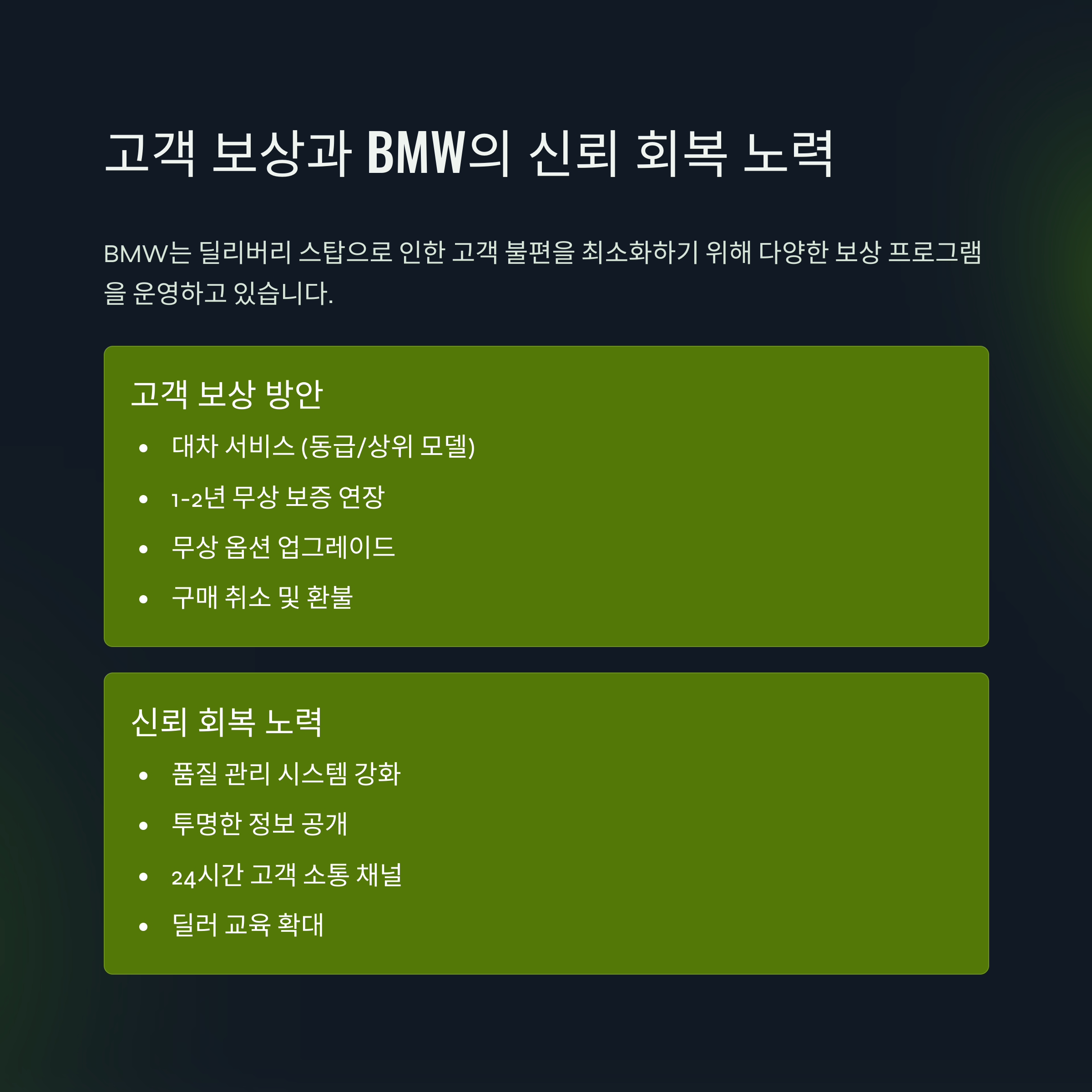 이러한 개선 조치들은 BMW의 프리미엄 브랜드 가치를 유지하고, 고객의 신뢰를 회복하며, 나아가 딜리버리 스탑 사태의 재발을 방지하기 위한 핵심 전략으로 작용하고 있습니다.