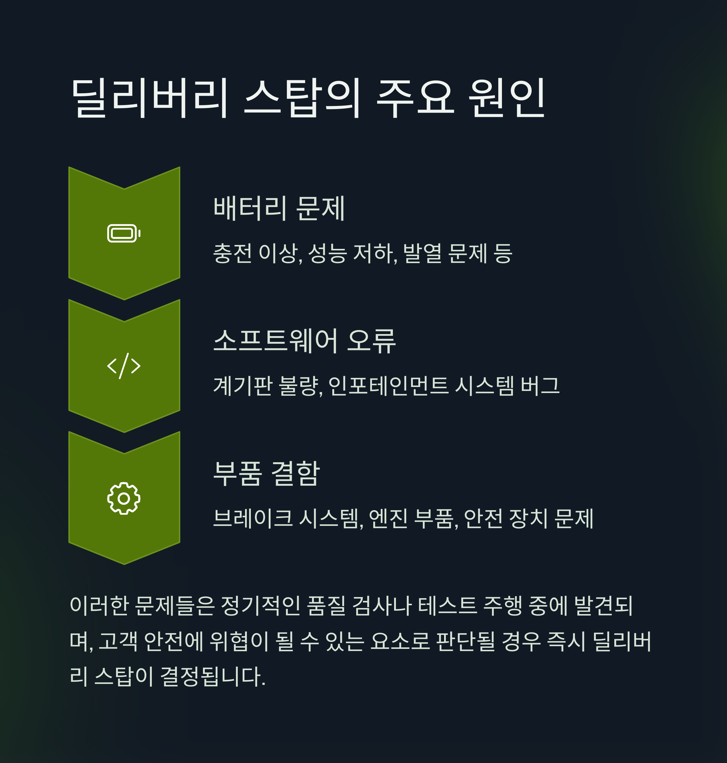 이러한 문제들은 대체로 제조 후 출고 전 점검 과정에서 확인되며, 간혹 소비자에게 인도되기 직전 혹은 도중에 발견되는 경우도 있습니다. 특히 최근에는 전기차 모델에서 배터리 이슈로 인한 딜리버리 스탑 사례가 급증하고 있습니다.