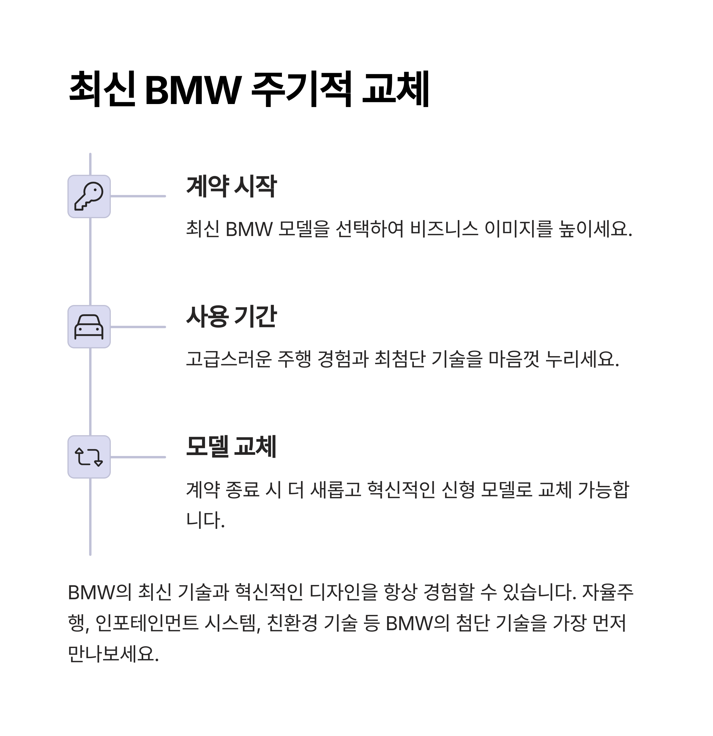 BMW 차량을 장기렌트로 선택하면 계약 기간이 끝날 때 새 차량으로 손쉽게 교체할 수 있습니다. 약 3~5년 주기로 교체가 가능하므로 최신 기술을 담은 차량 경험이 항상 보장됩니다.