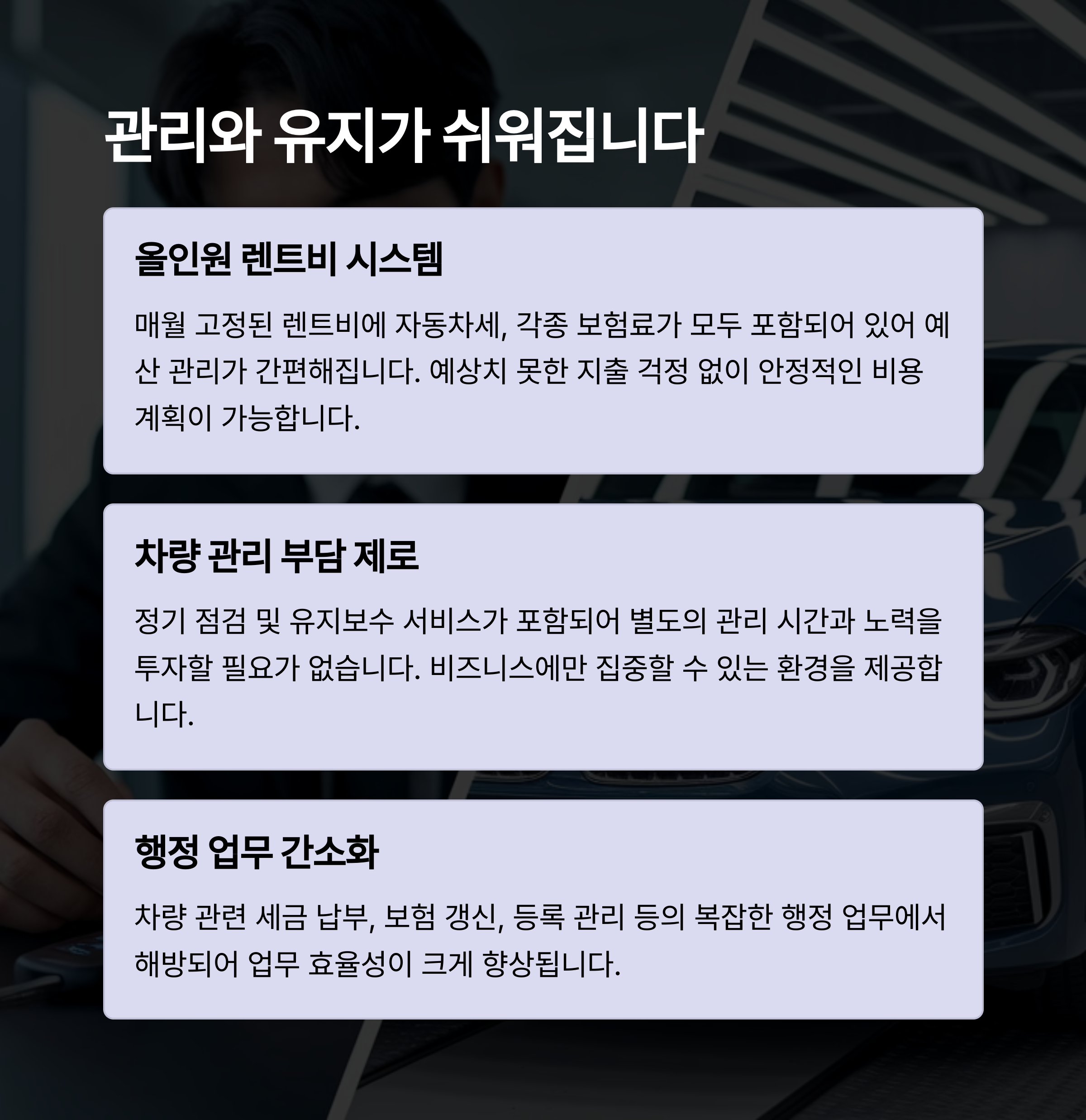 렌트 계약을 통해 자동차세, 보험료를 따로 신경 쓸 필요 없이 한 번에 해결할 수 있으며, 차량 정비와 유지보수 부담 또한 줄어듭니다.