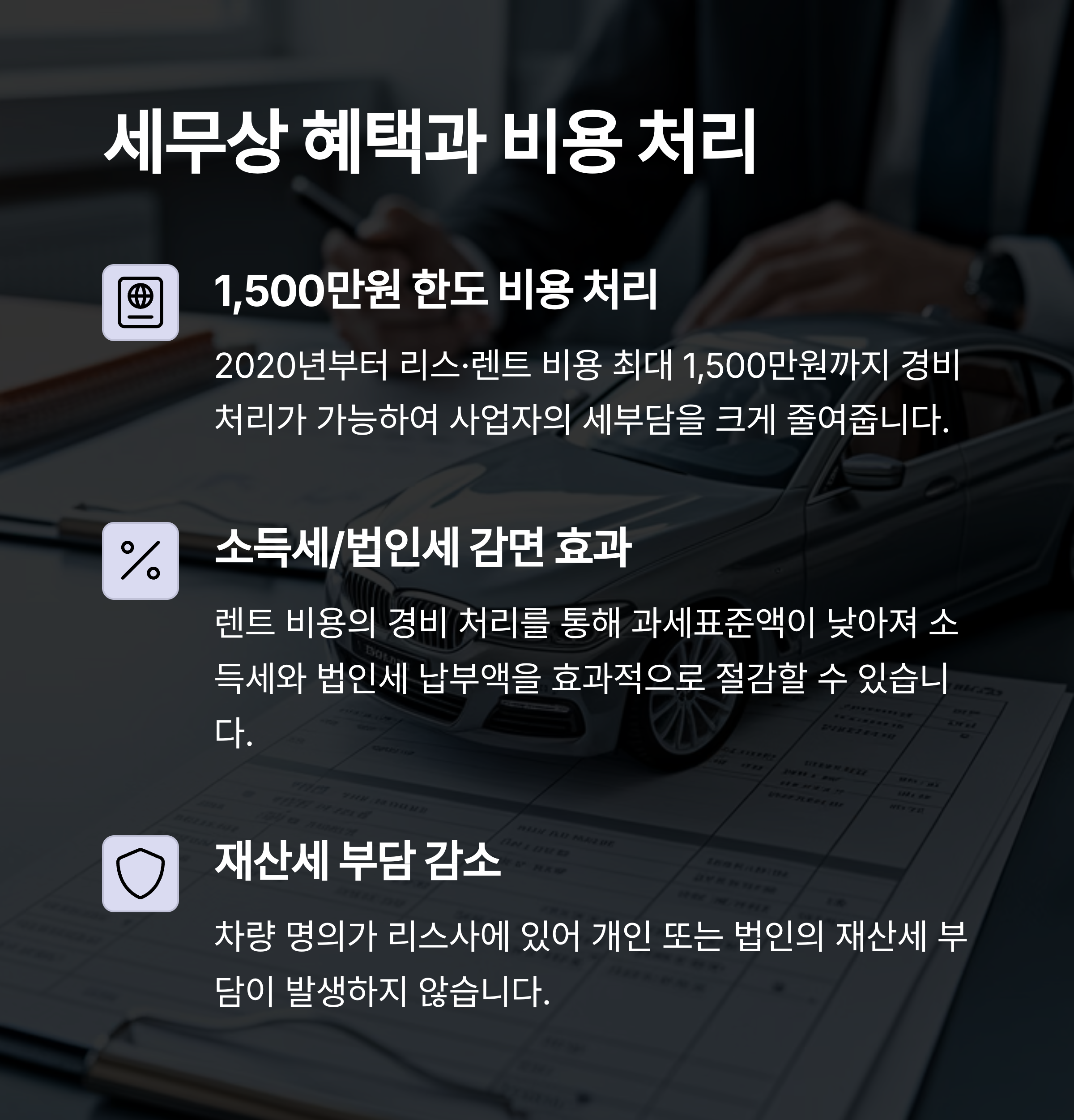 또한, 법인 및 개인사업자의 경우 세무상 비용 처리에서의 혜택을 받을 수 있습니다. 2020년부터 자동차 관련 비용 중 최대 1,500만 원까지 세무 처리 가능하며, 이 중 800만 원은 차량 렌트비 처리로, 나머지 700만 원은 유지비로 처리됩니다.