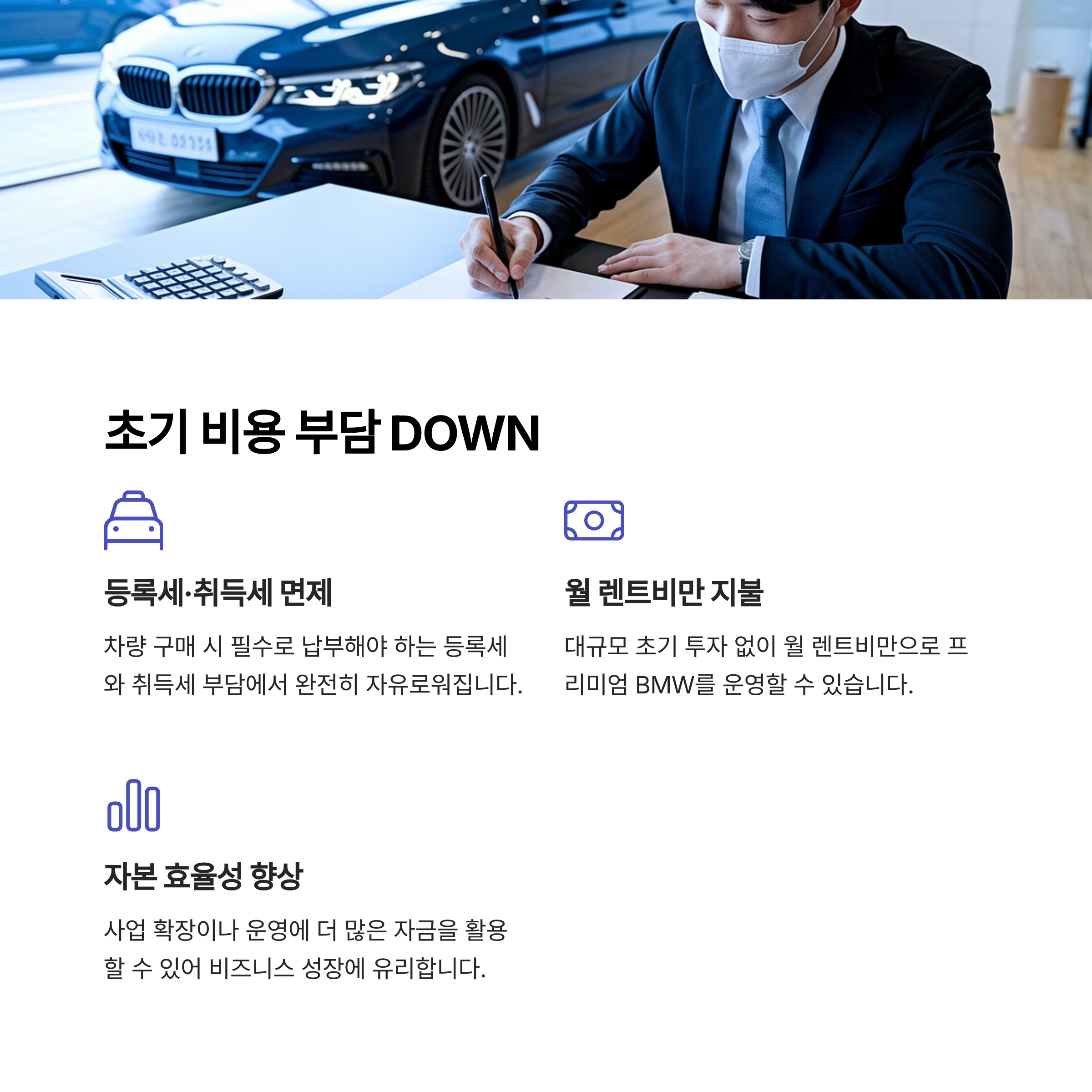 BMW 렌트 구매는 초기 투자 비용 부담을 대폭 줄여주는 장점이 있습니다. 초기 등록세와 취득세가 포함되지 않기 때문에, 신차 구매에 비해 현금 흐름에 긍정적인 영향을 미칩니다.