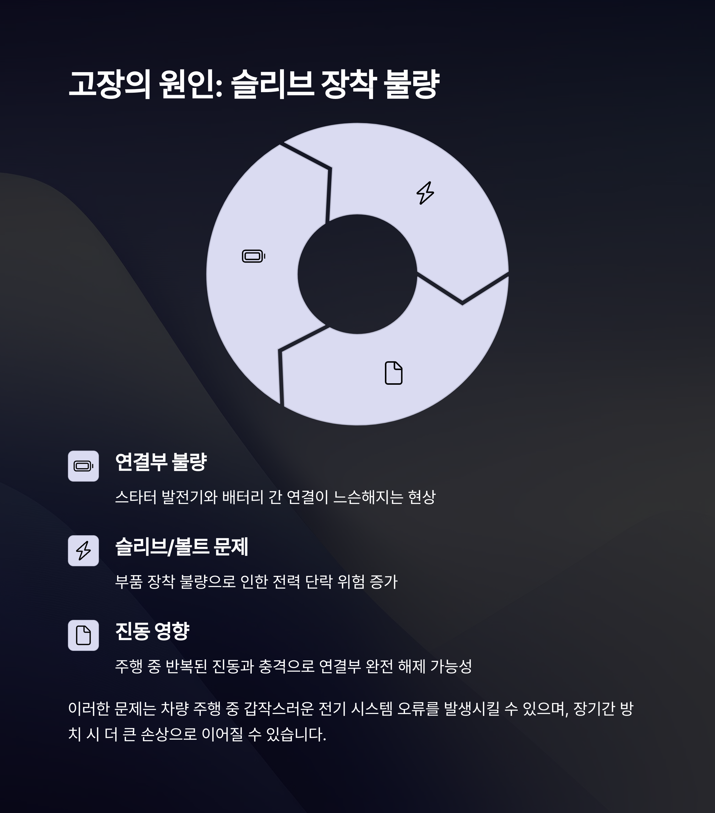 이로 인해 충전 불량, 시동 꺼짐, 심할 경우 화재 발생 위험까지 있다고 합니다.