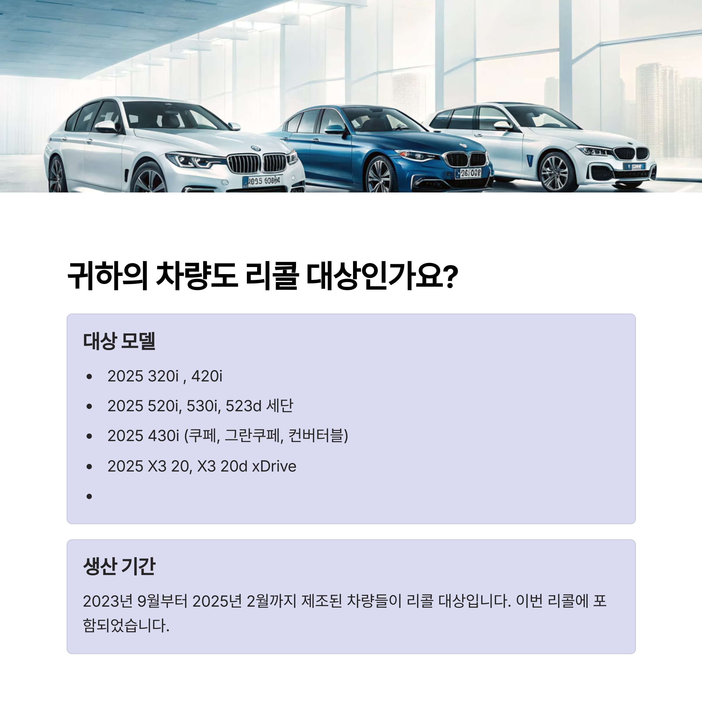리콜 대상은 2023년 9월 1일부터 2025년 2월 20일까지 생산된 BMW 주요 차종입니다.