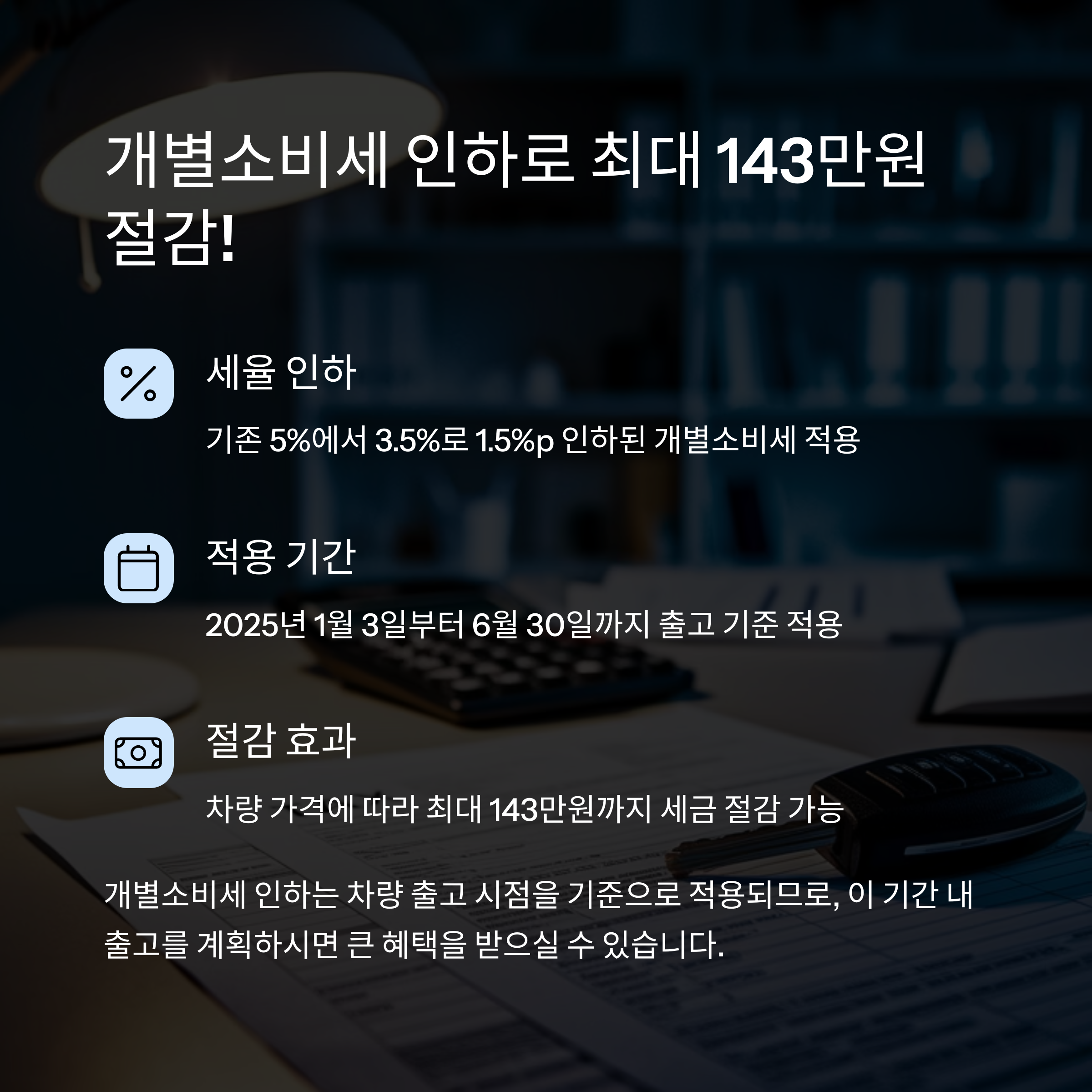 | 개별소비세 인하 기간 | 2025년 1월 3일 ~ 6월 30일 |