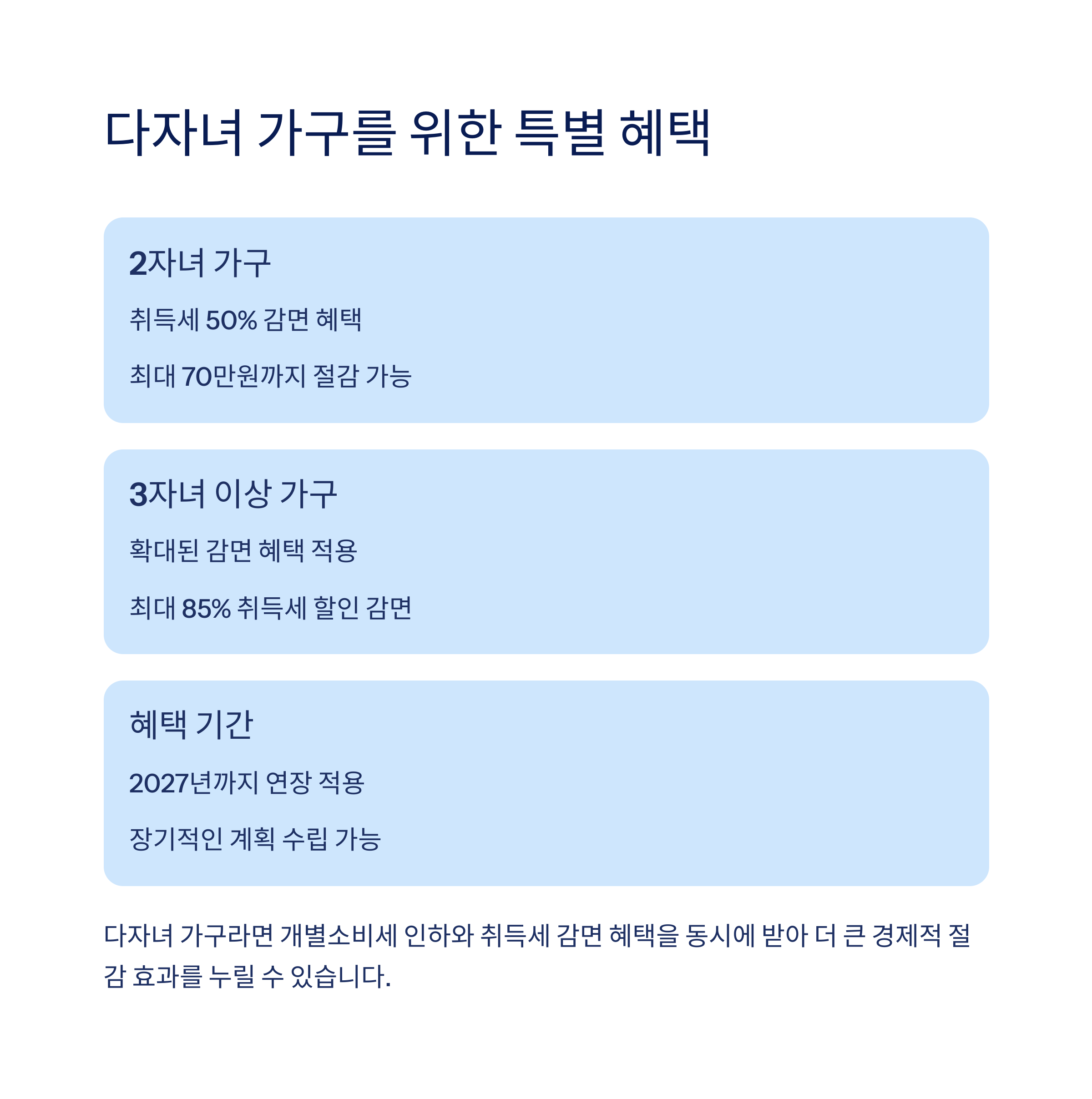 다자녀 가구를 대상으로 한 취득세 감면 혜택도 크게 확대되어 많은 소비자들에게 실질적 도움이 될 전망입니다.