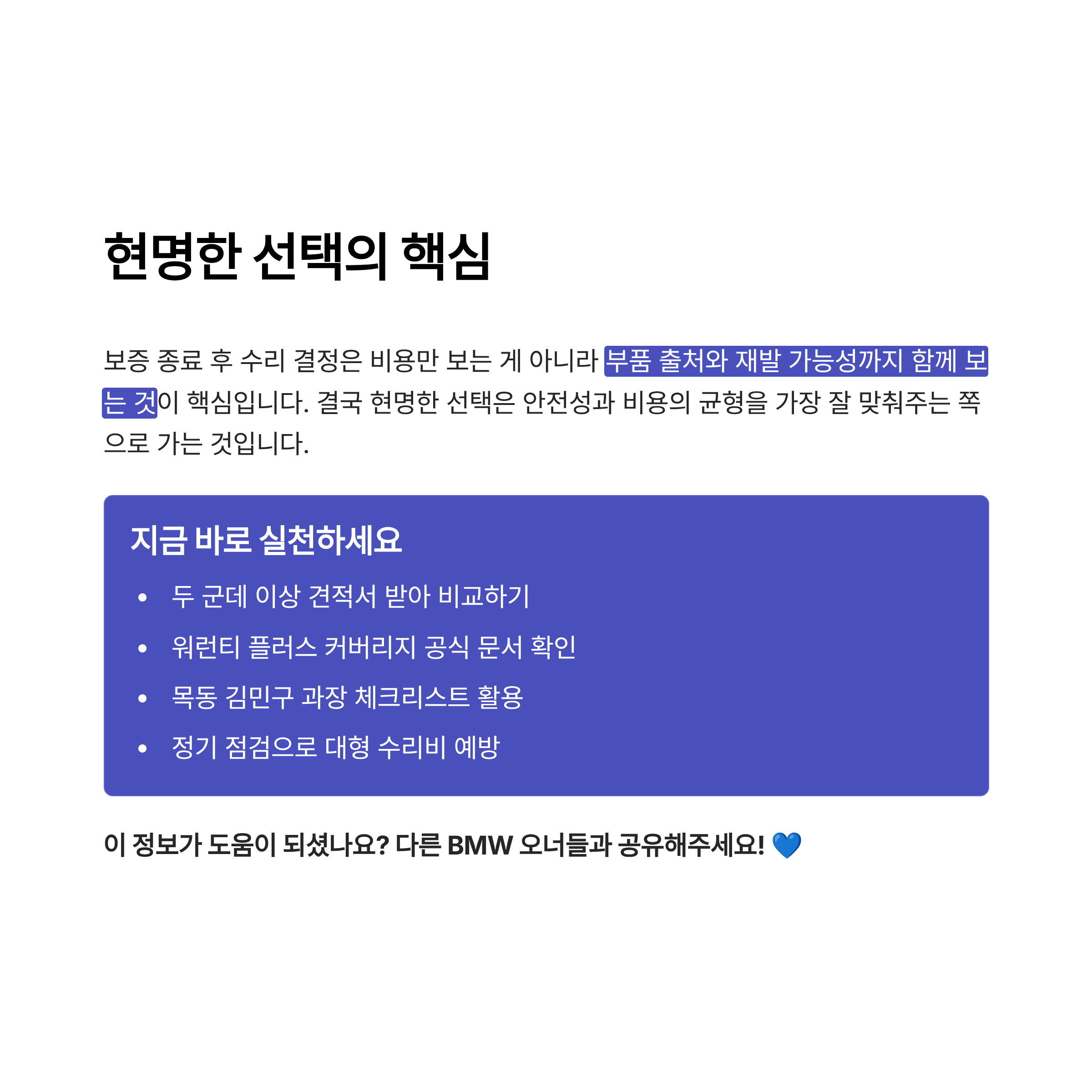 - 만약 보증 기간이 이미 만료됐다면, 신뢰도 높은 BMW 전문 사설업체의 견적으로 비용 절감을 최대화하는 전략이 현실적입니다.