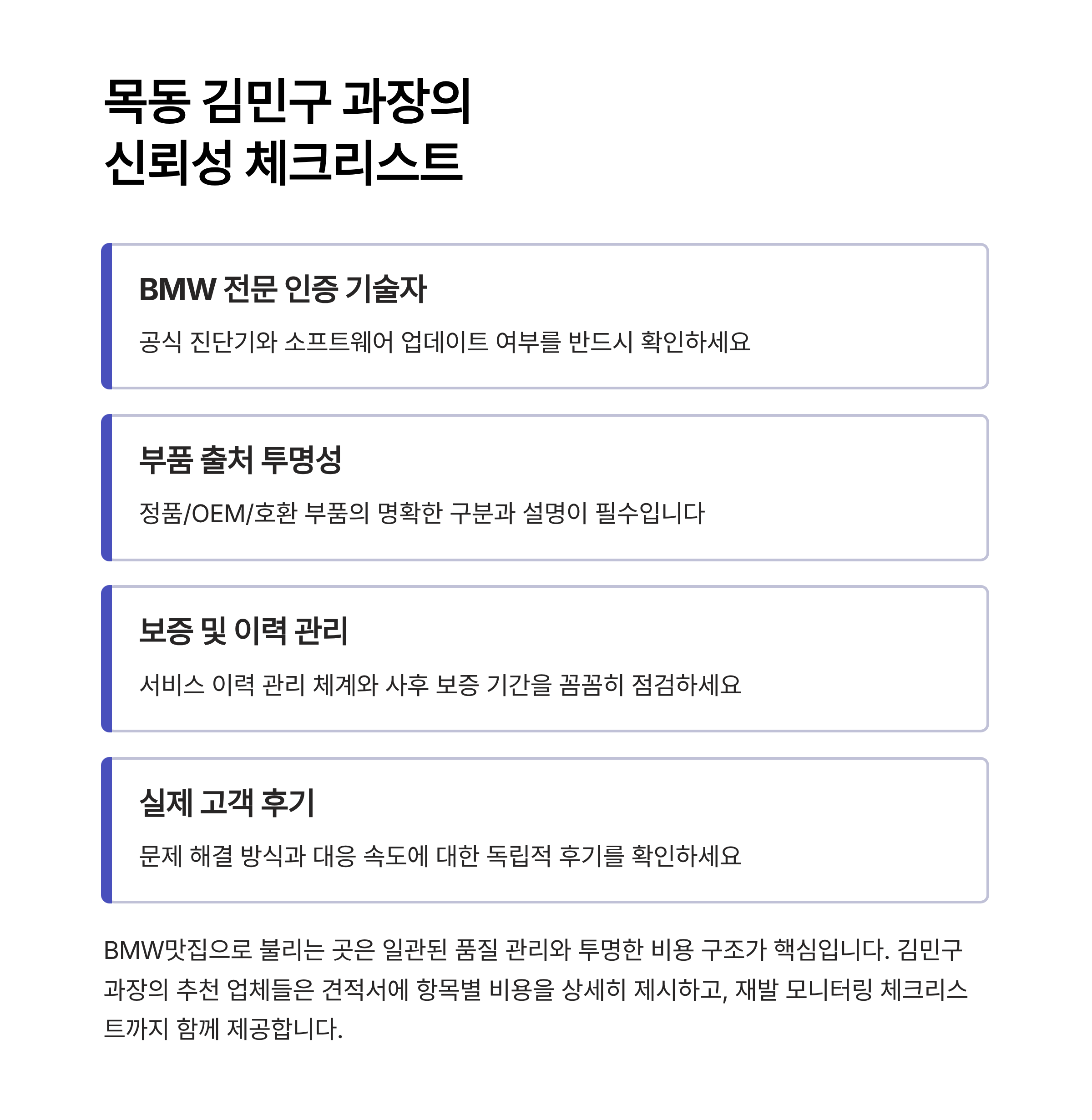 - 지역 신뢰 포인트로는 BMW맛집과 김민구 과장의 체크리스트를 활용해 투명성과 안전성을 확보하자.