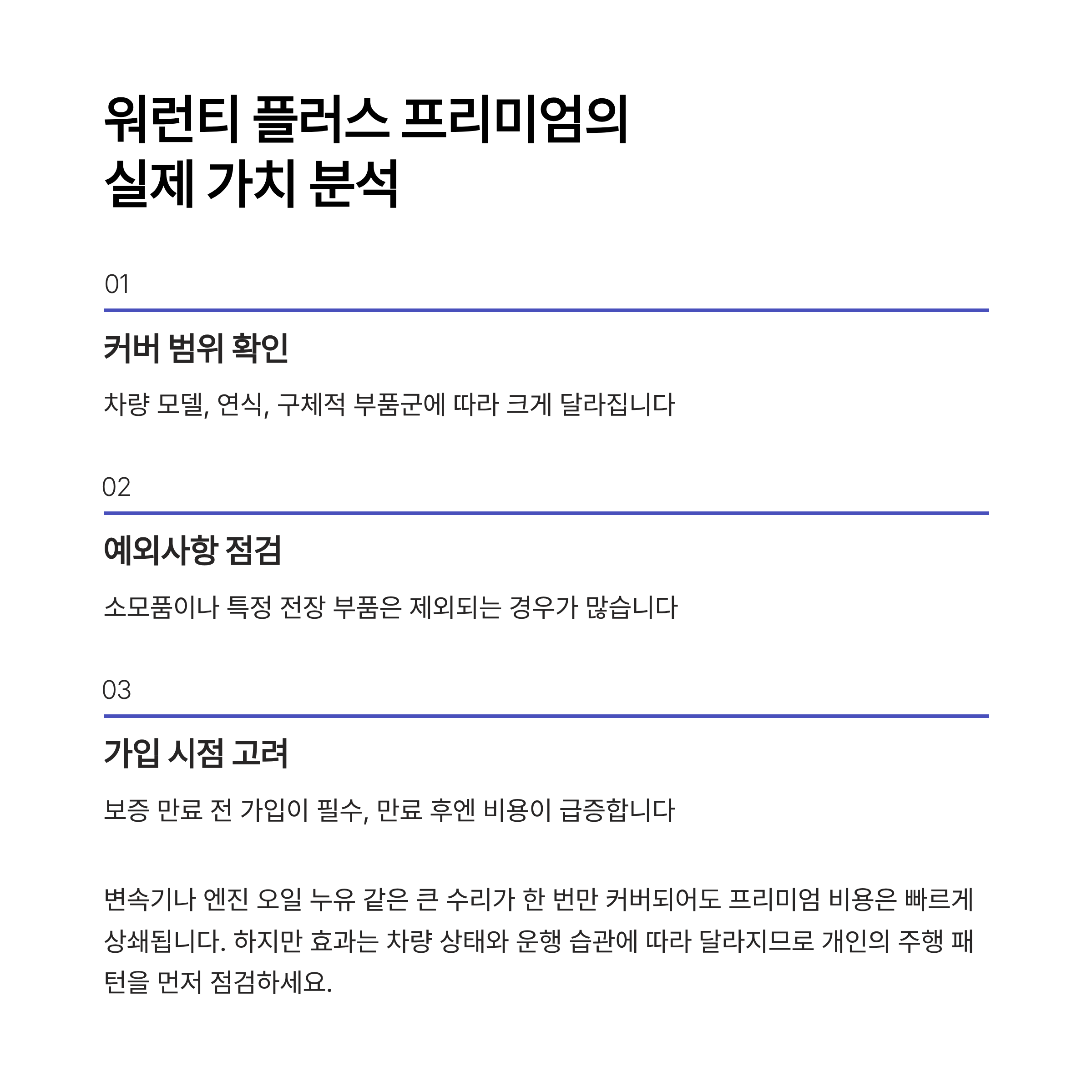 - 워런티 플러스 프리미엄은 커버 범위와 실제 비용 절감액에 따라 큰 가치를 만들 수 있다.