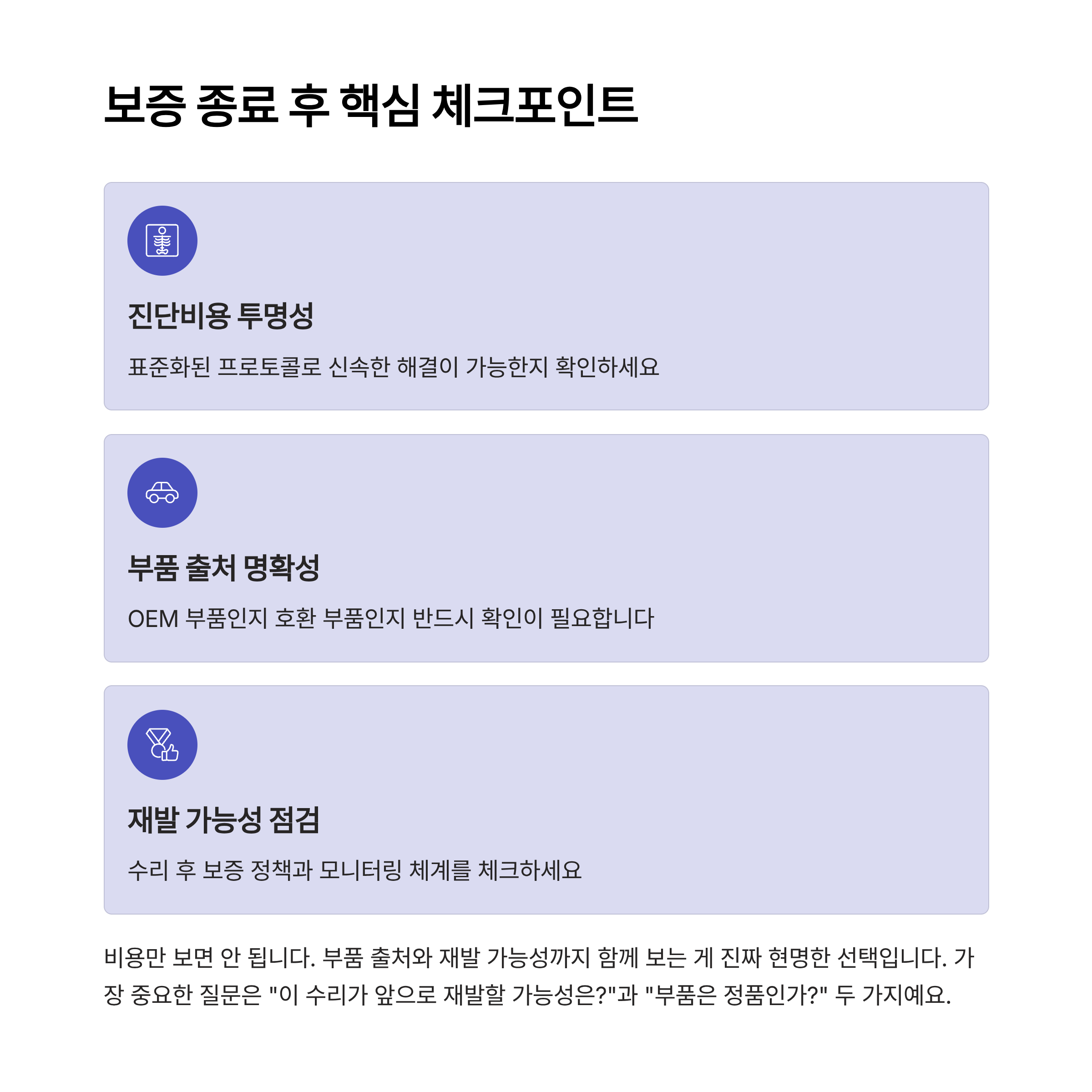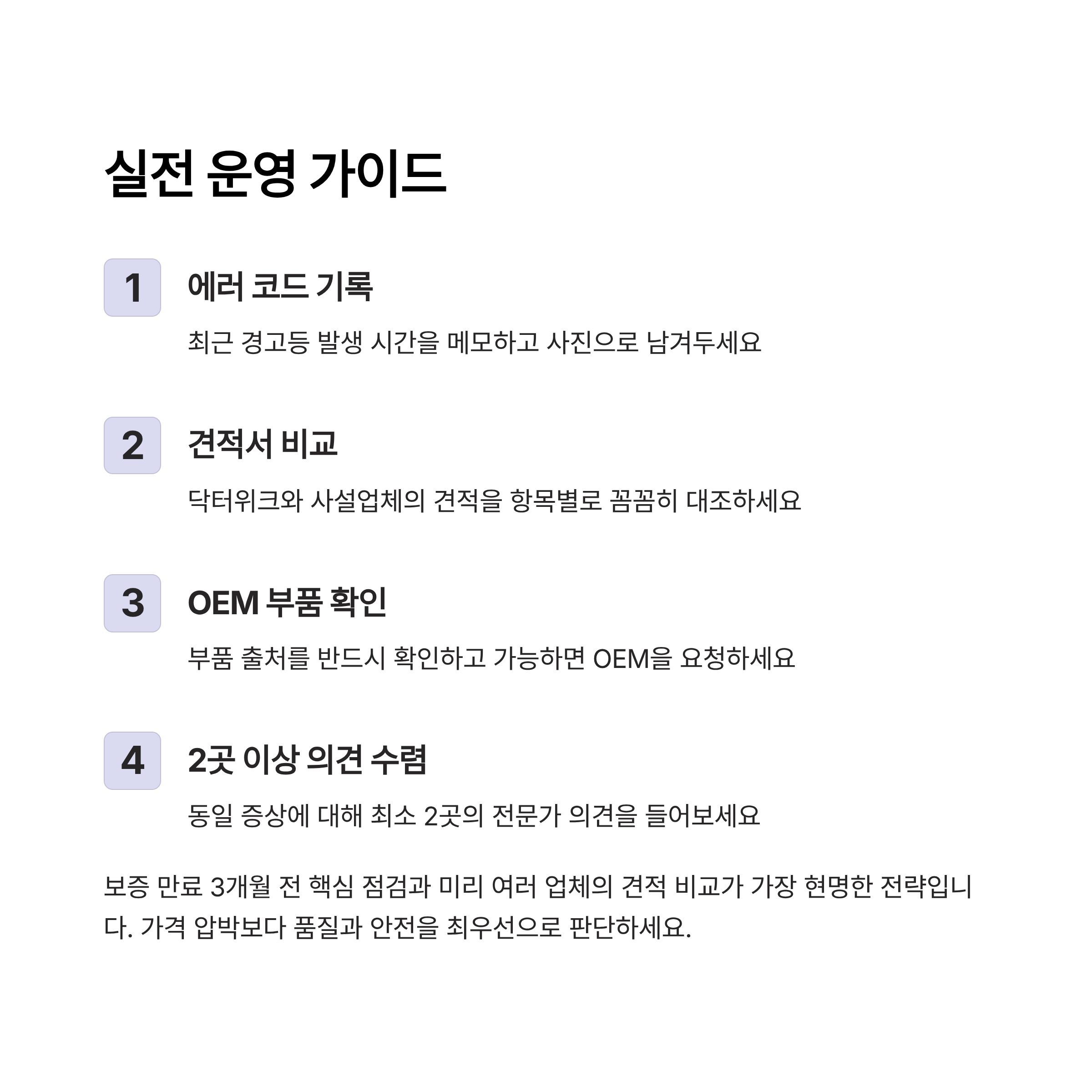 - 보증 만료 3개월 전 핵심 점검과 미리 여러 업체의 견적 비교가 가장 현명한 전략이다.