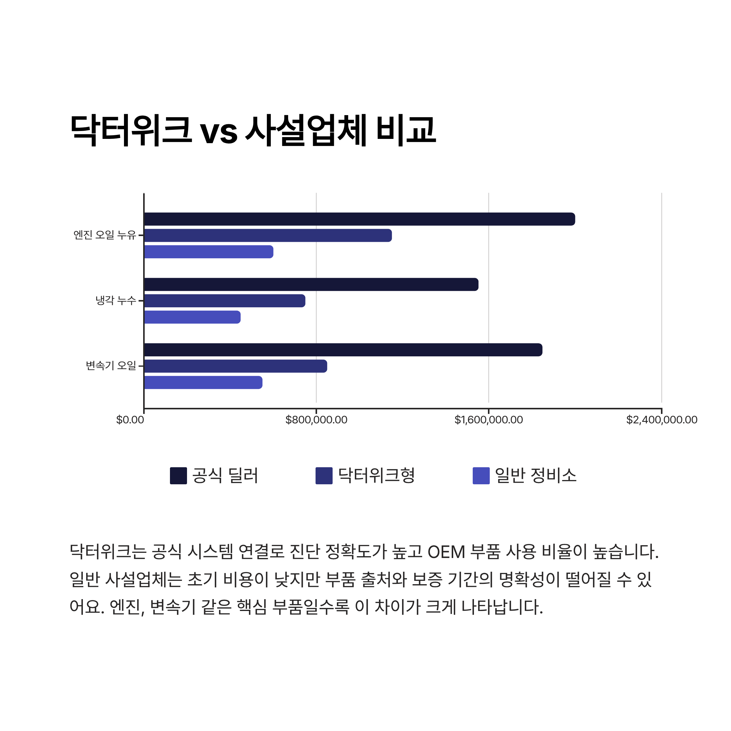 - 닥터위크는 속도와 비교적 합리적 비용, OEM 부품 비율이 높은 편이고, 사설업체는 비용은 낮은 편이지만 품질과 보증의 차이가 있다.
