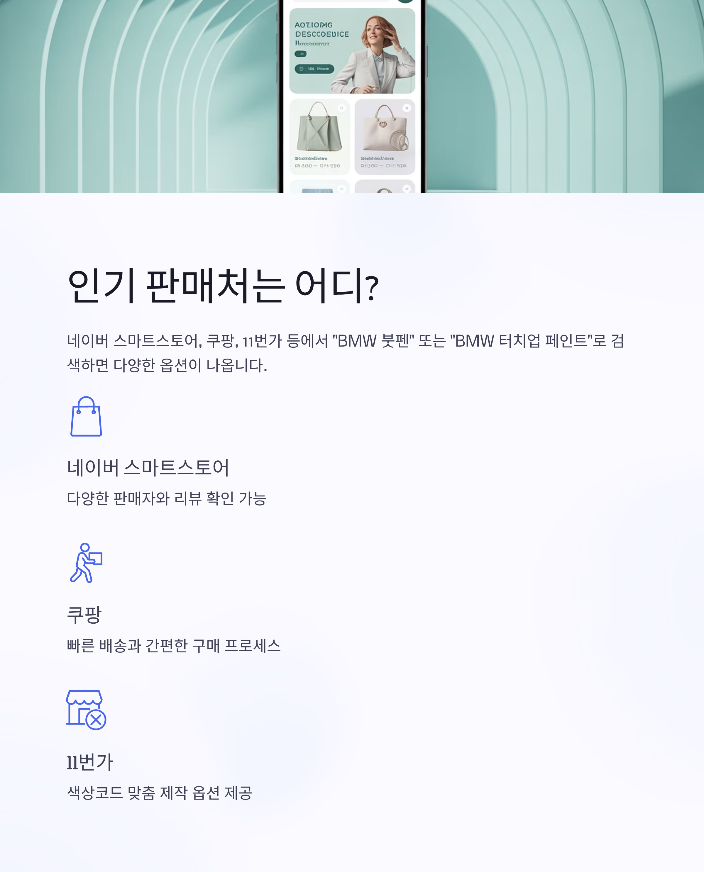 "BMW 붓펜" 또는 "BMW 터치업 페인트"로 검색하면 다양한 옵션이 나옵니다.