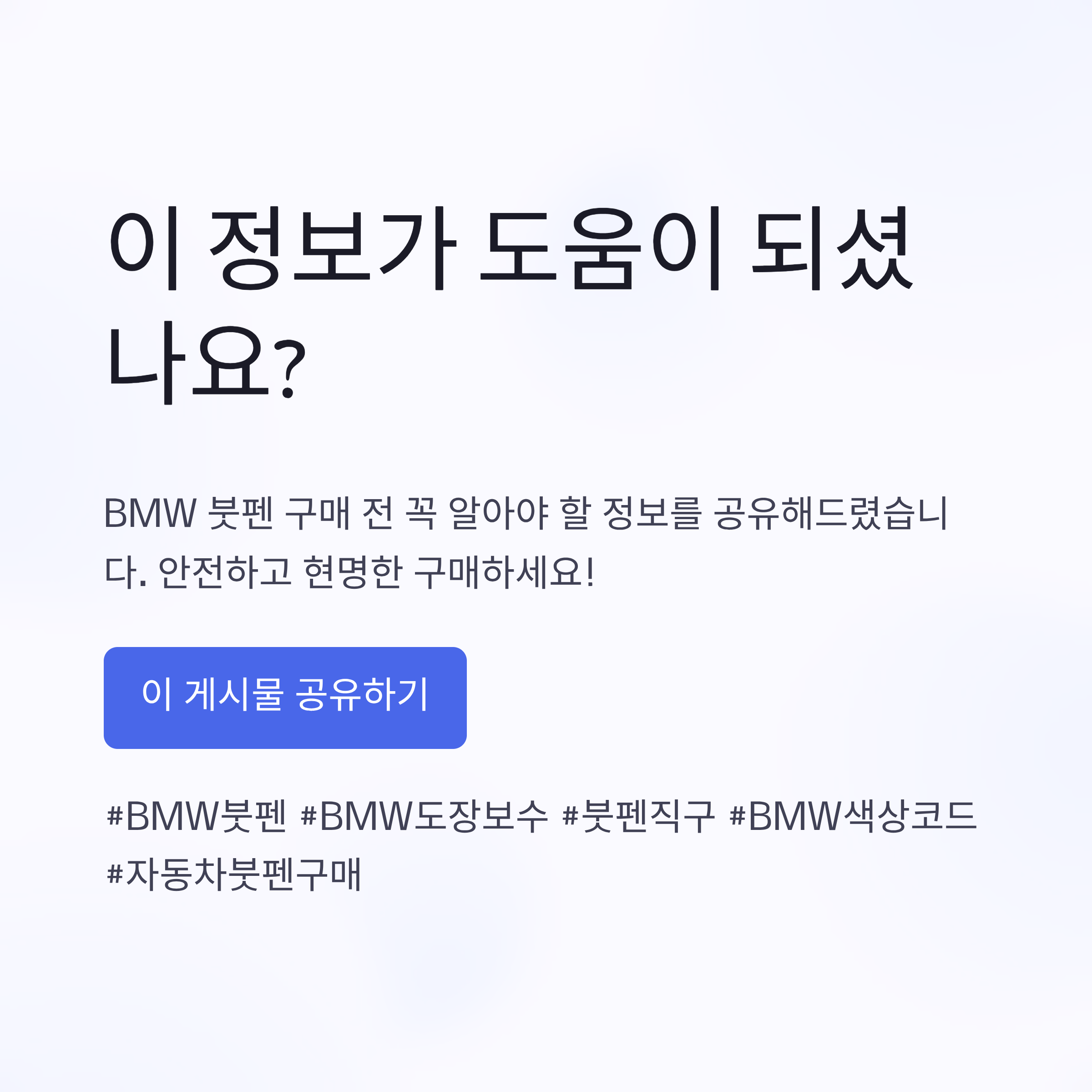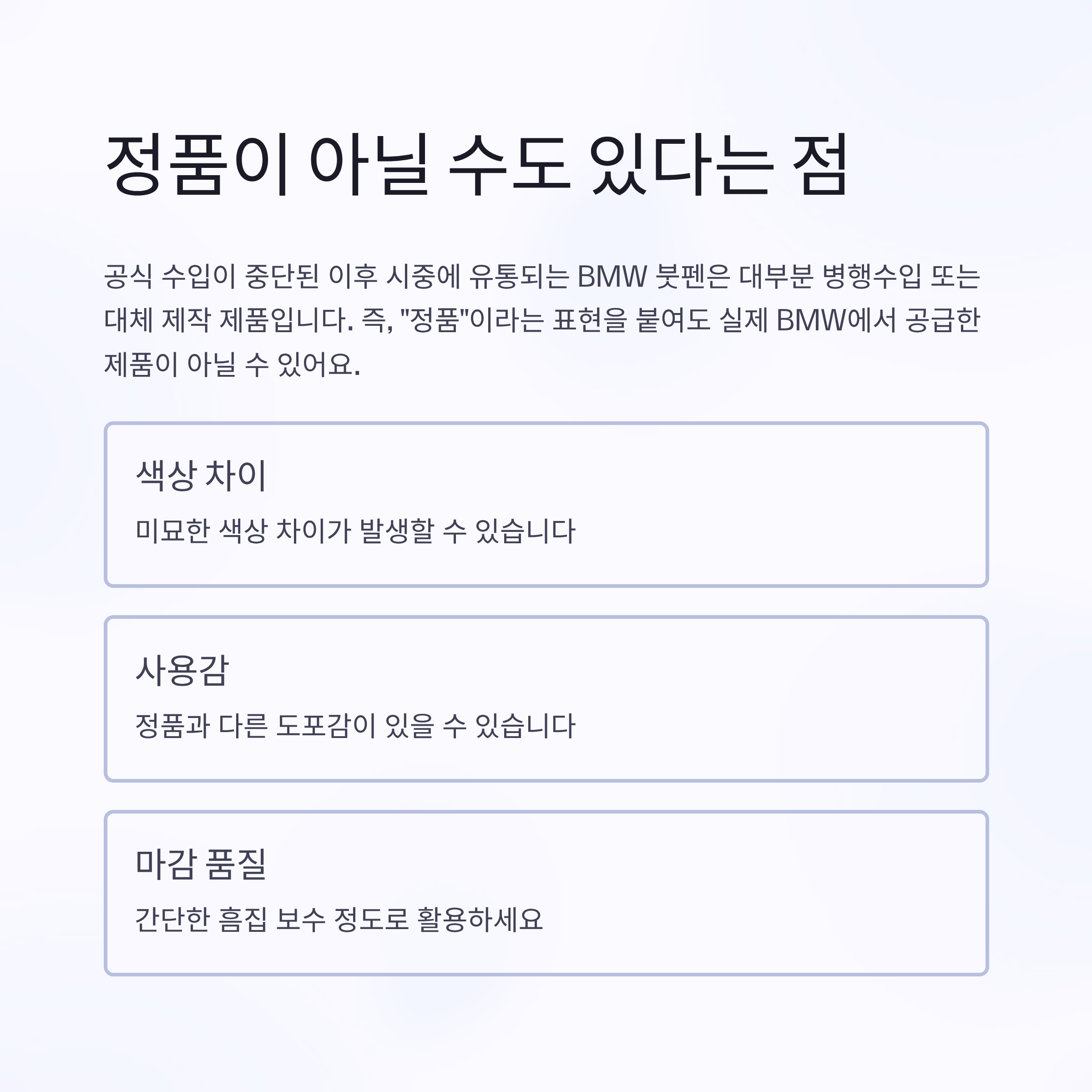 실제 BMW 차량 색상 코드와 정확히 일치하는 제품인지 확인하는 것이 가장 중요합니다.
