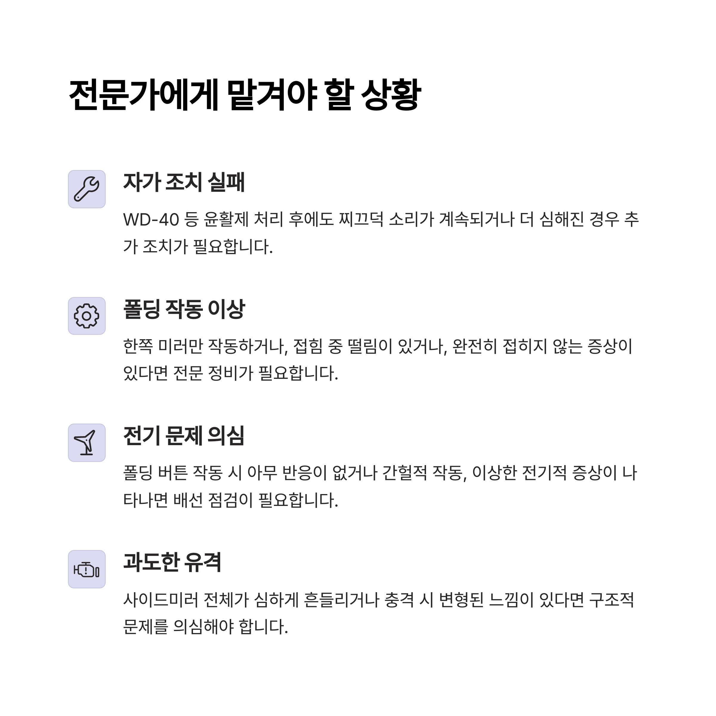 "WD-40을 사용해도 소음이 줄지 않거나, 미러가 움직이지 않는 경우"
