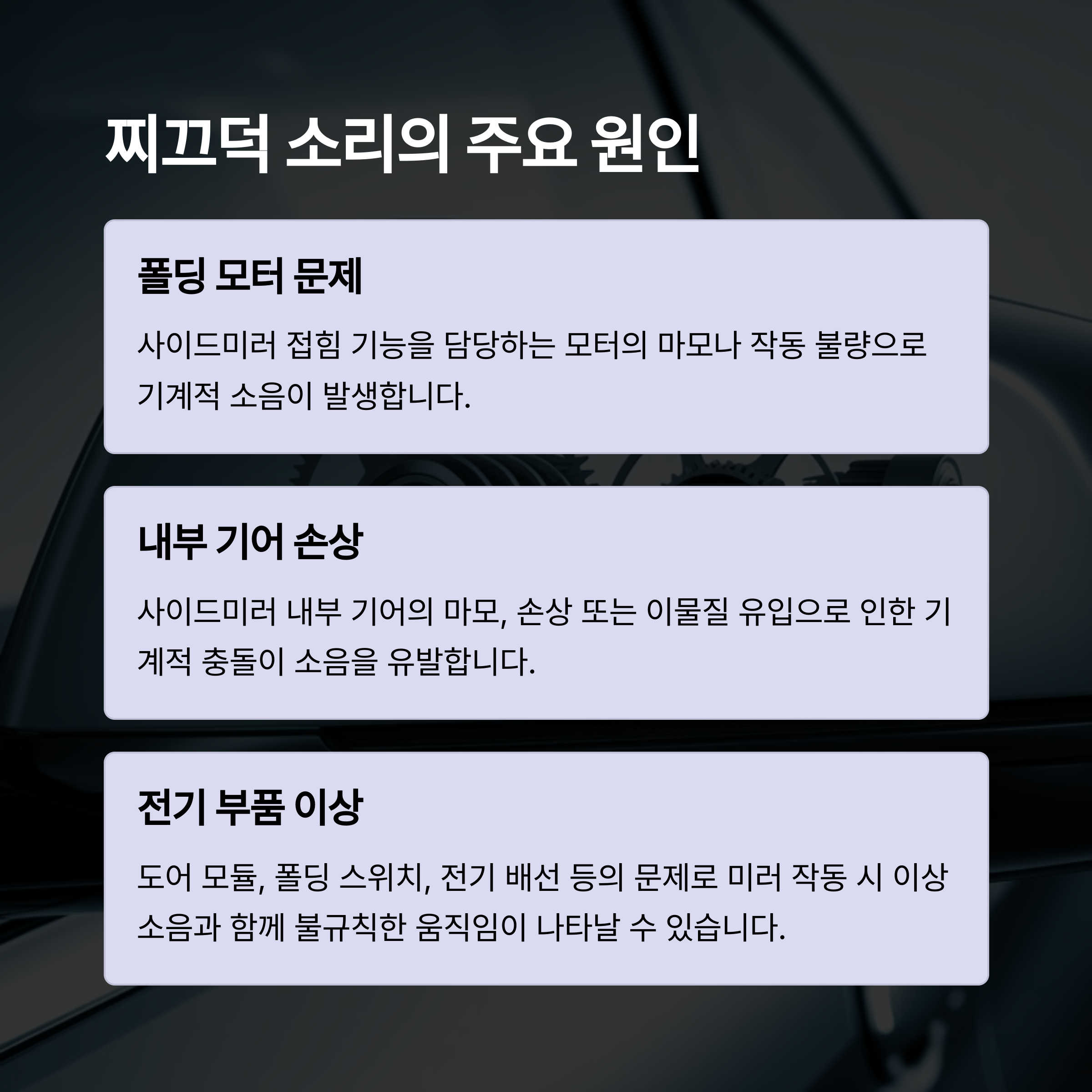 사이드미러 소리가 계속되거나, 움직임이 비정상적인 경우는 부품 교체가 필요할 수 있습니다.