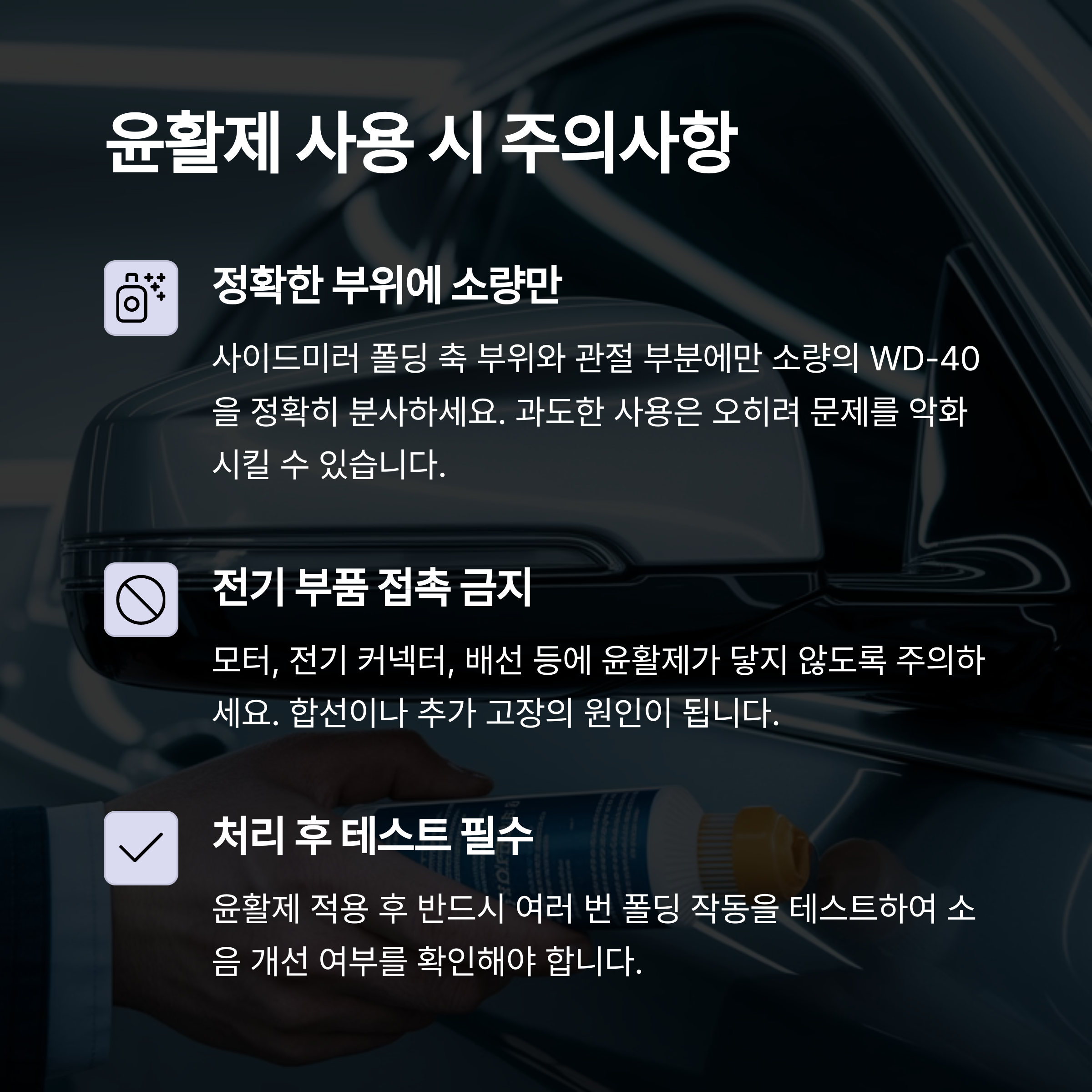 사이드미러의 움직이는 부분이나 경첩 부분에 적당량을 분사한 뒤