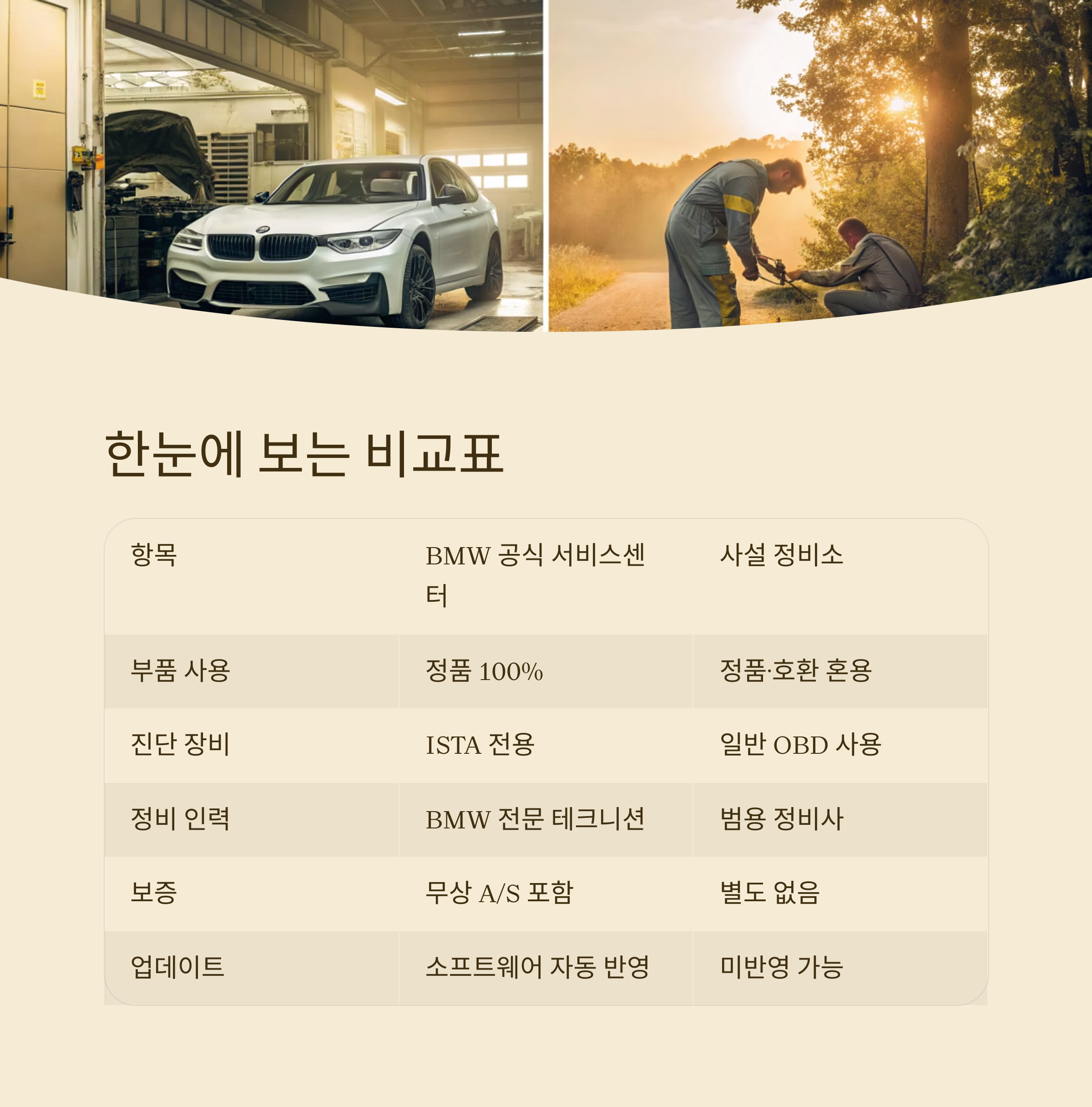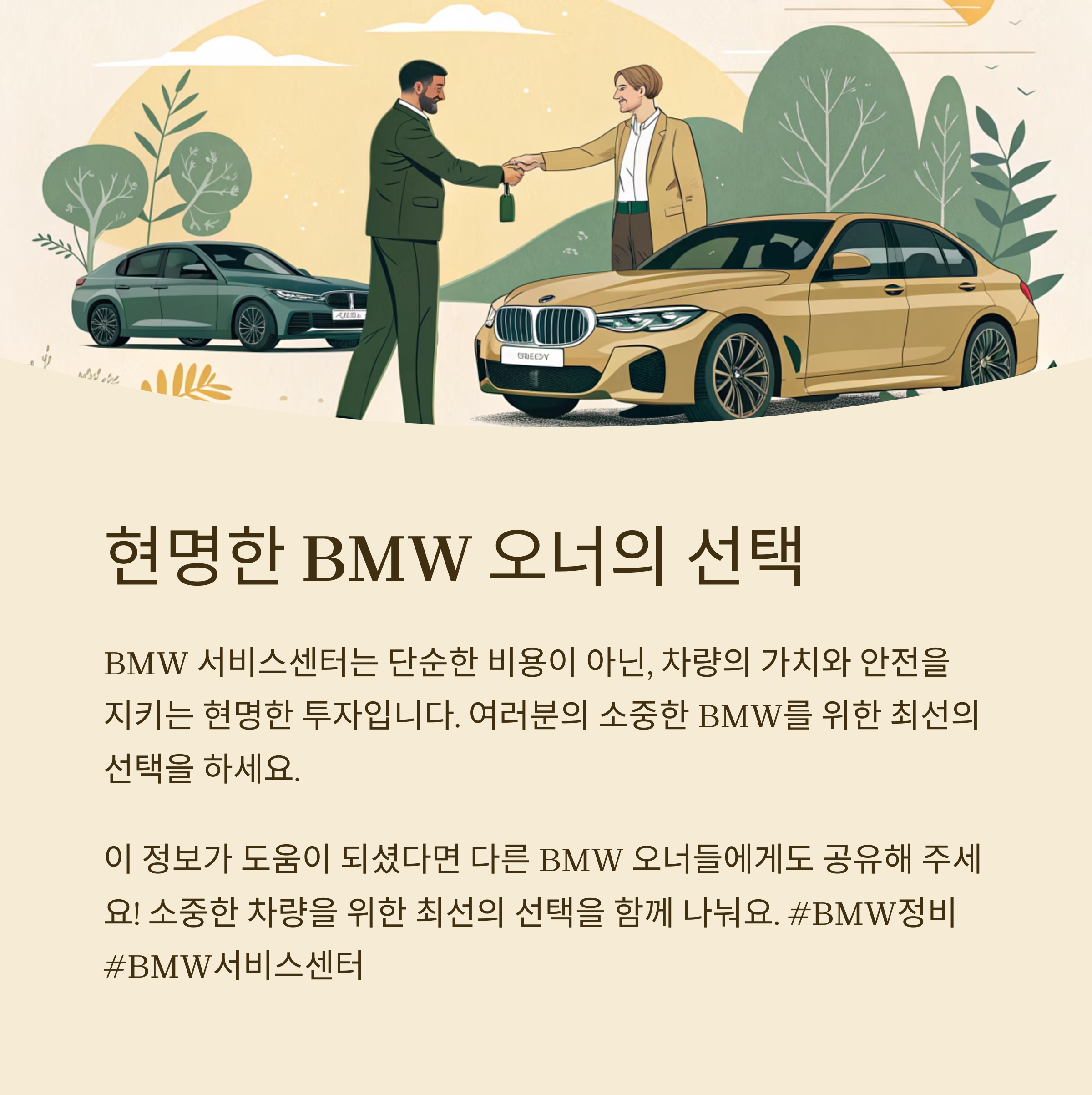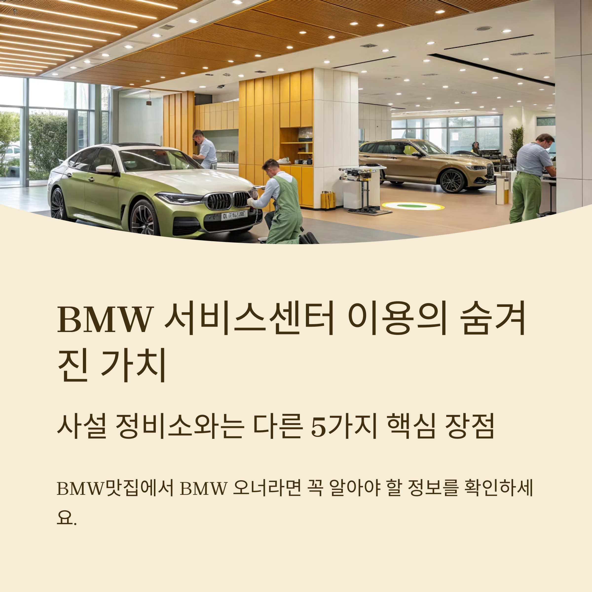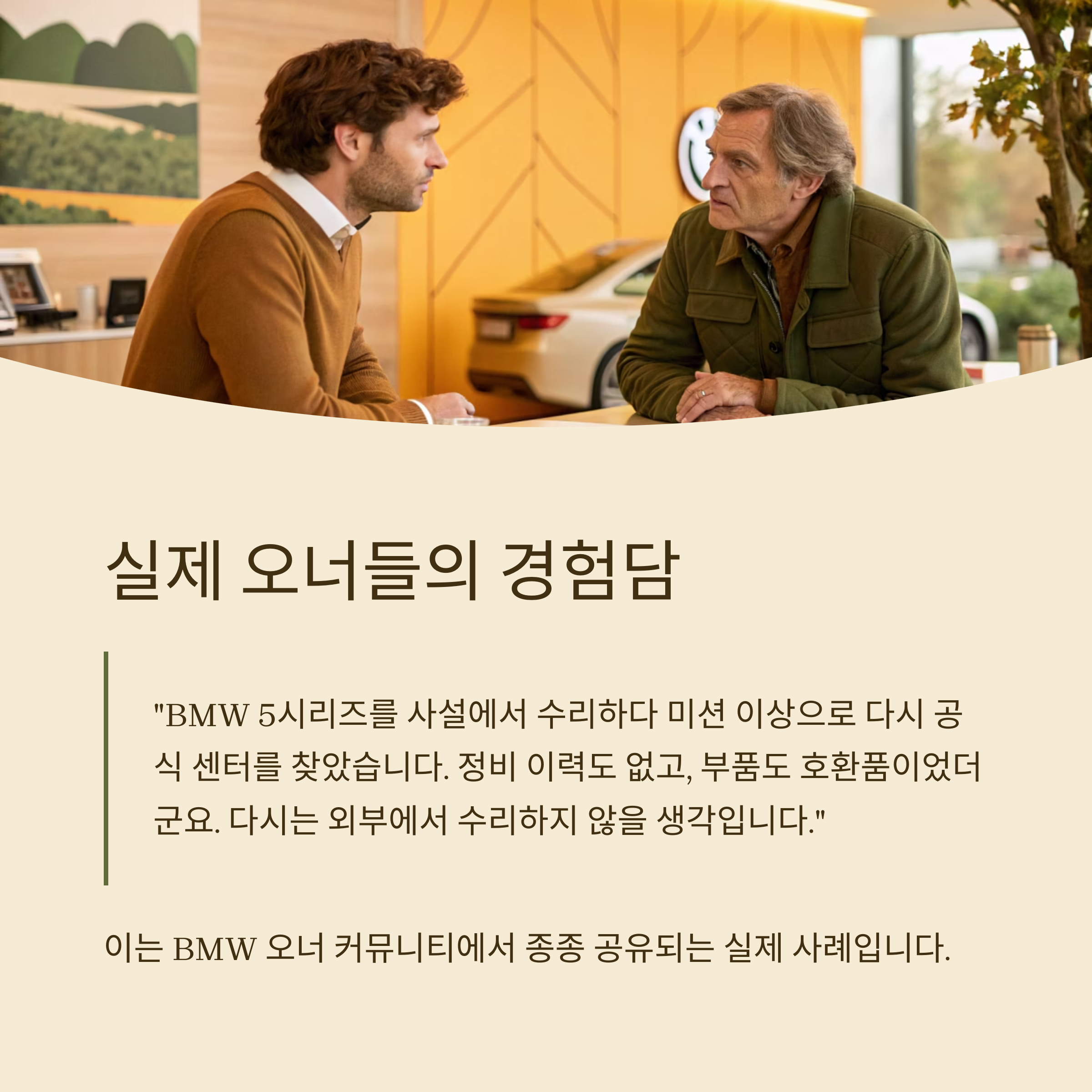 사설 정비소는 가격이 저렴해 보이지만, BMW 공식 서비스센터가 제공하는 전문성과 신뢰성은 비교 불가입니다.