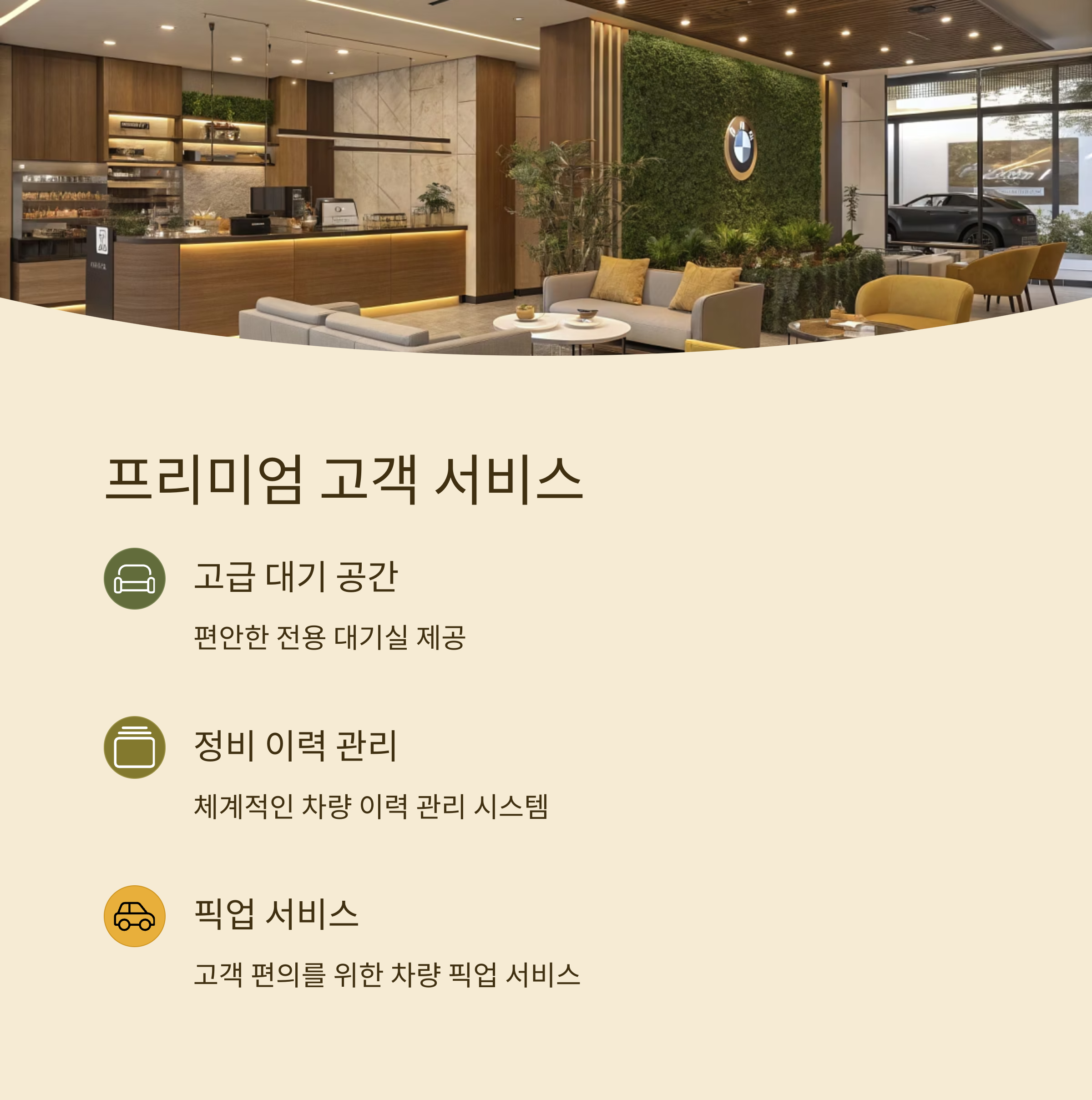 고급 차량에 걸맞은 전용 대기실, 정비 이력 관리, 픽업 서비스 등 고객 서비스 품질이 압도적입니다.