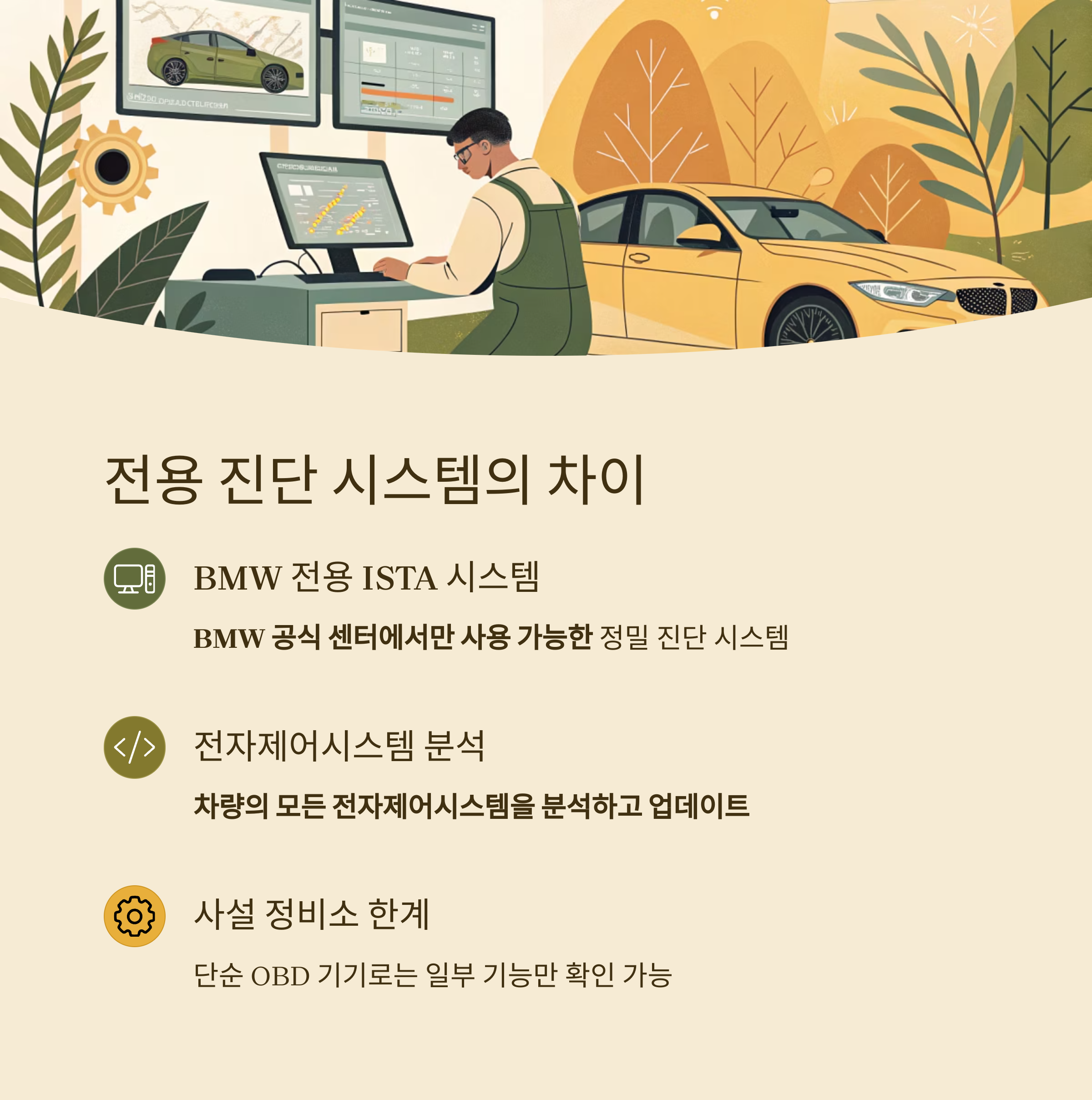 | 진단 장비 | ISTA 전용 | 일반 OBD 사용 |