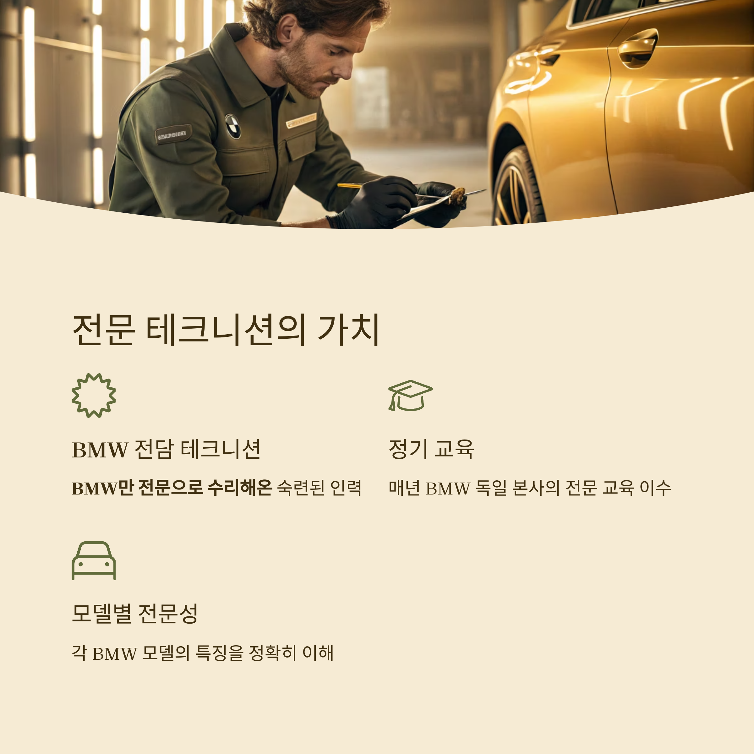 이들은 매년 BMW 독일 본사의 교육을 받고, 모델별 특징을 정확히 이해하고 있습니다.