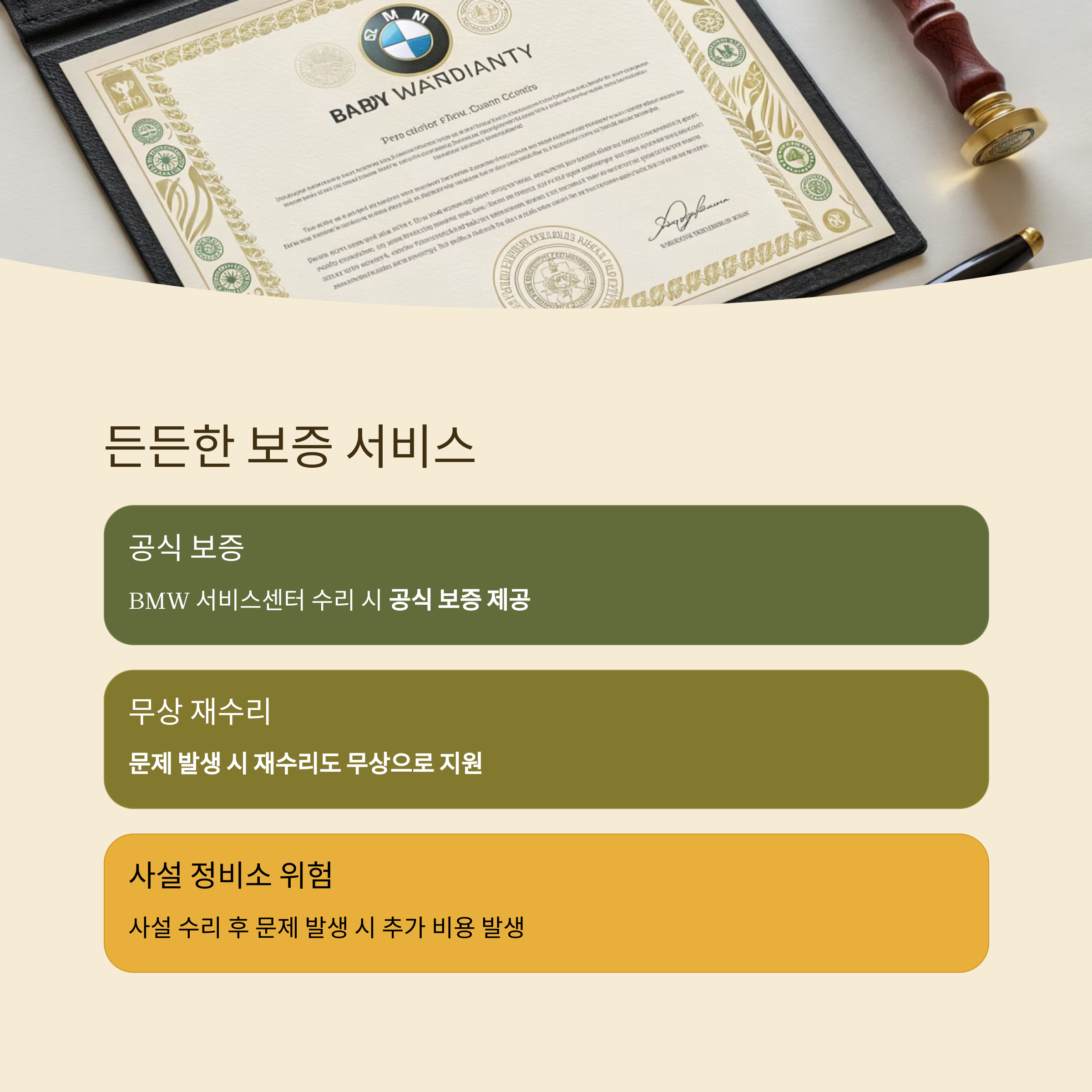 BMW 서비스센터에서 수리받을 경우 공식 보증이 제공되며, 문제 발생 시 재수리도 무상으로 지원됩니다.