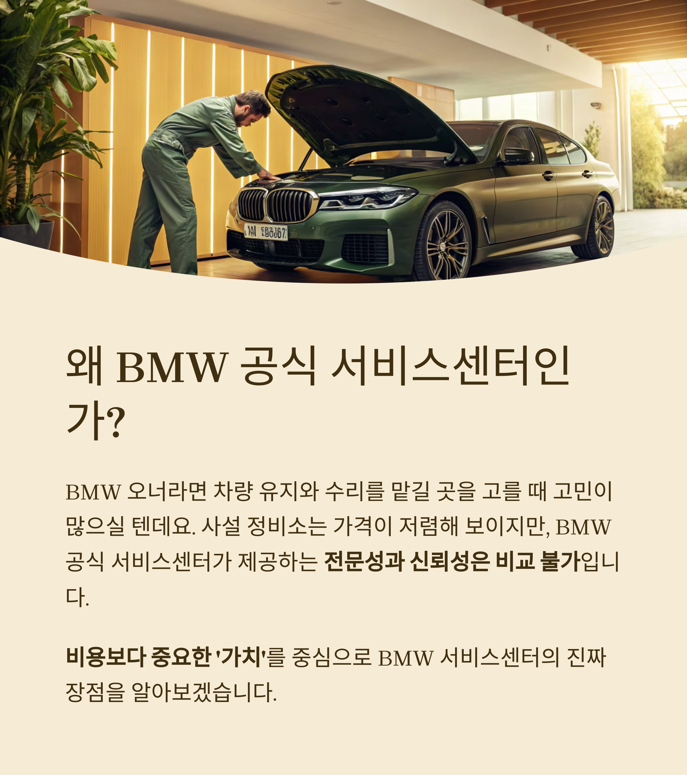 사설 정비소는 가격이 저렴해 보이지만, BMW 공식 서비스센터가 제공하는 전문성과 신뢰성은 비교 불가입니다.