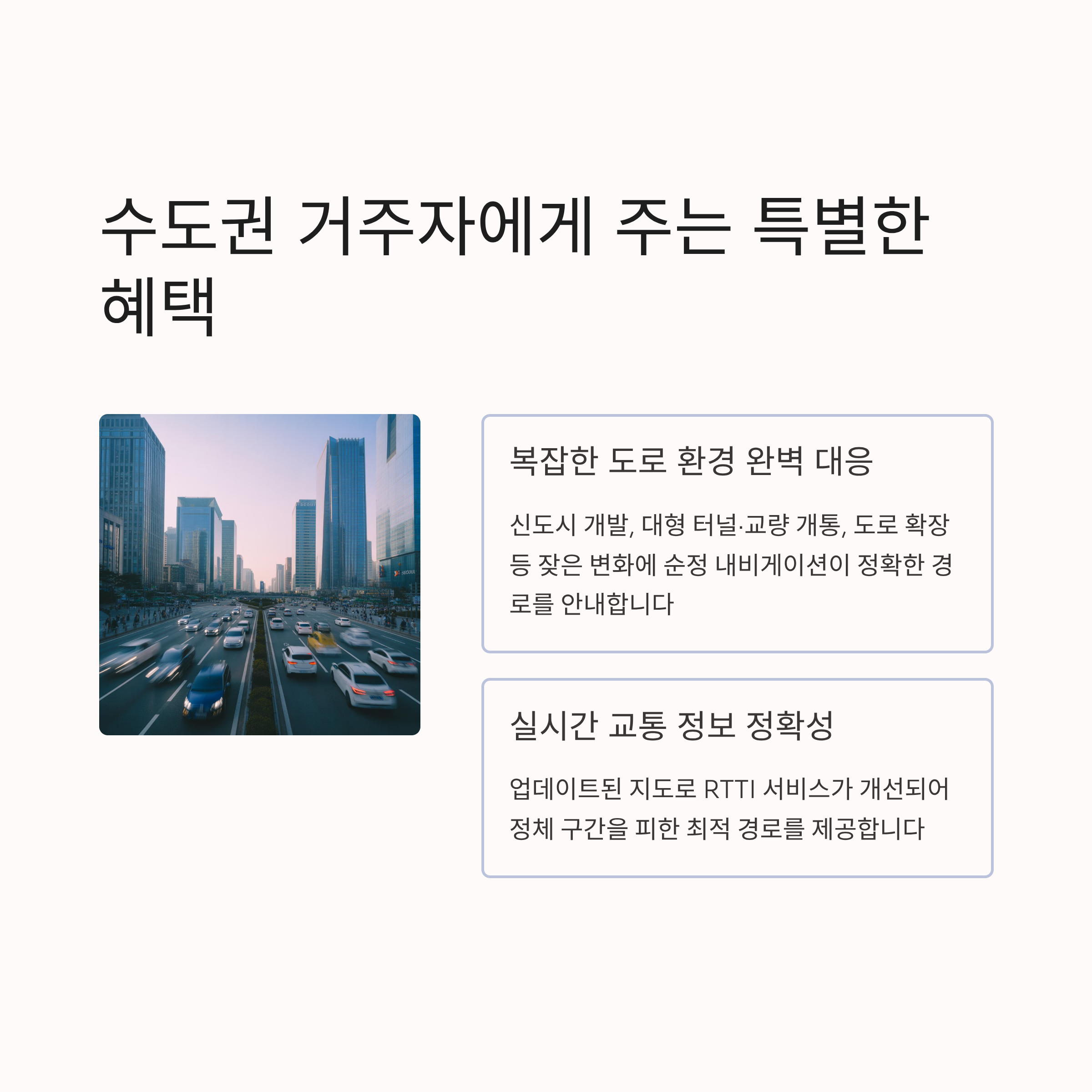 - 복잡한 도로 환경: 수도권은 신도시 개발, 대형 터널 및 교량 개통, 도로 확장 등 도로 변화가 잦습니다. 업데이트를 통해 이런 최신 도로 정보가 반영되면, 순정 내비게이션의 경로 안내 정확도가 크게 향상되어 복잡한 도심에서의 길 찾기가 훨씬 수월해집니다.