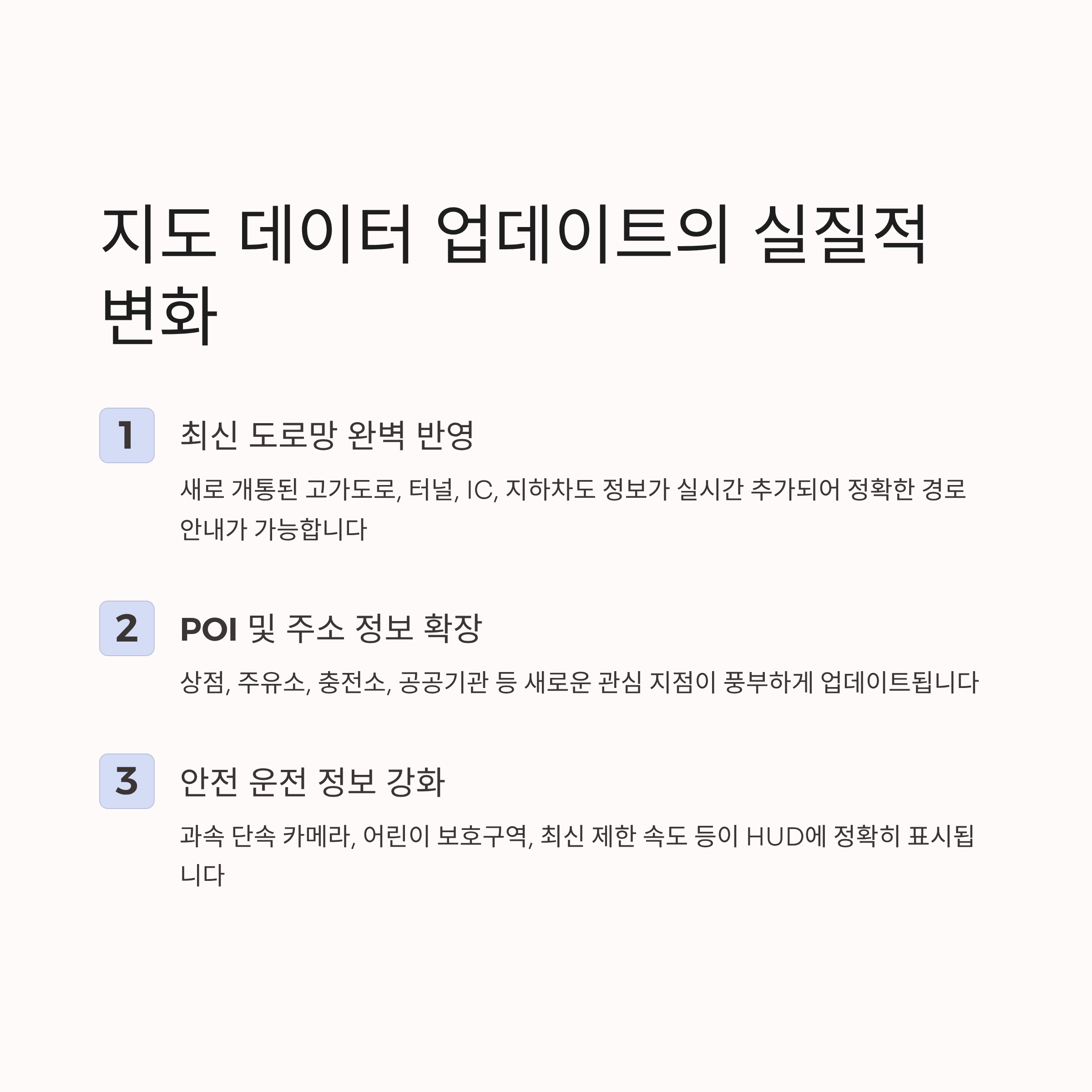 - 실시간 교통 정보의 정확성: 업데이트된 지도 데이터는 실시간 교통 정보(RTTI) 서비스의 정확성에도 기여하여, 정체 구간을 피해 최적의 경로를 안내하는 데 도움을 줍니다.
