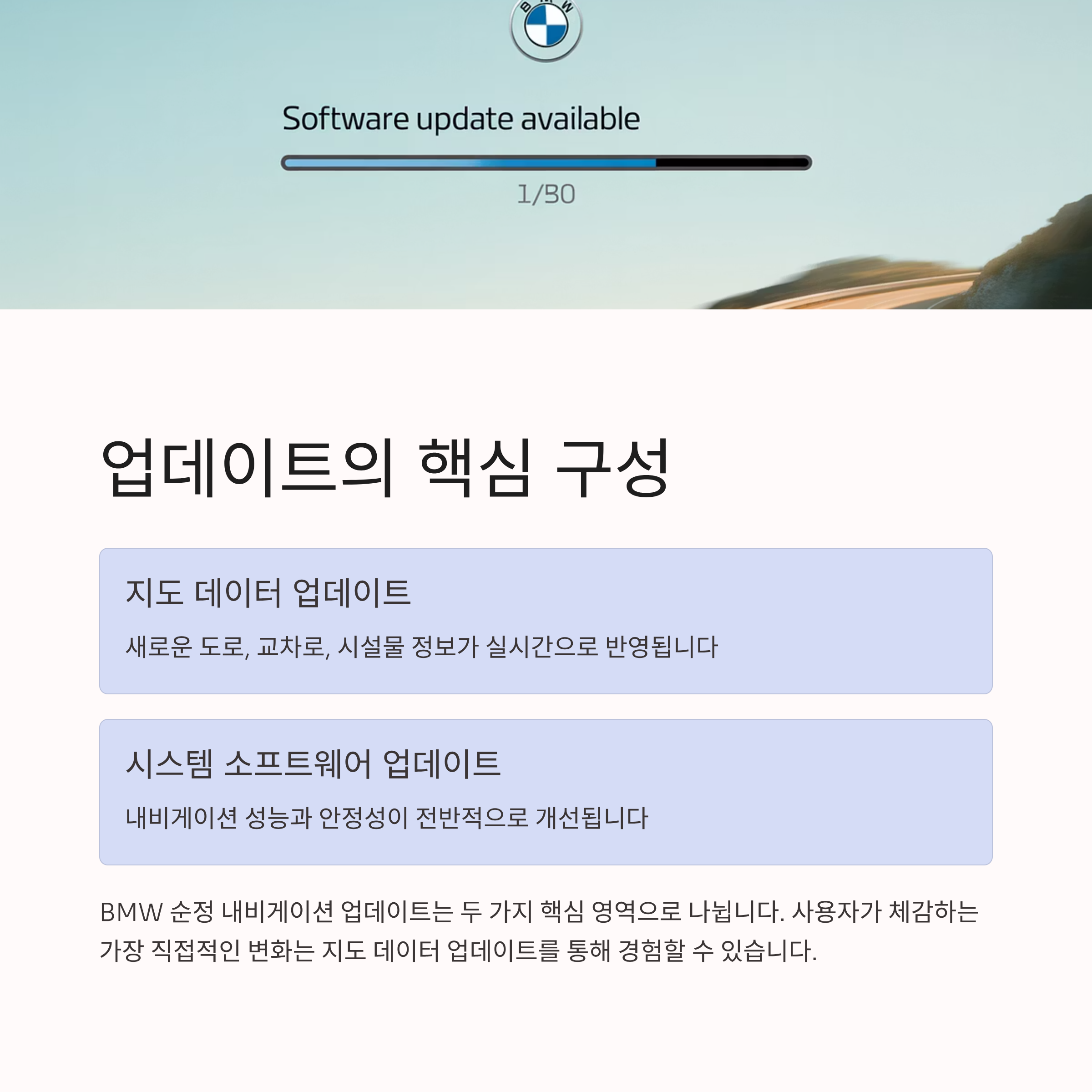 BMW 순정 내비게이션 업데이트는 크게 지도 데이터 업데이트와 시스템 소프트웨어 업데이트를 포함합니다. 사용자에게 직접적인 변화는 주로 지도 데이터 업데이트에서 체감됩니다.
