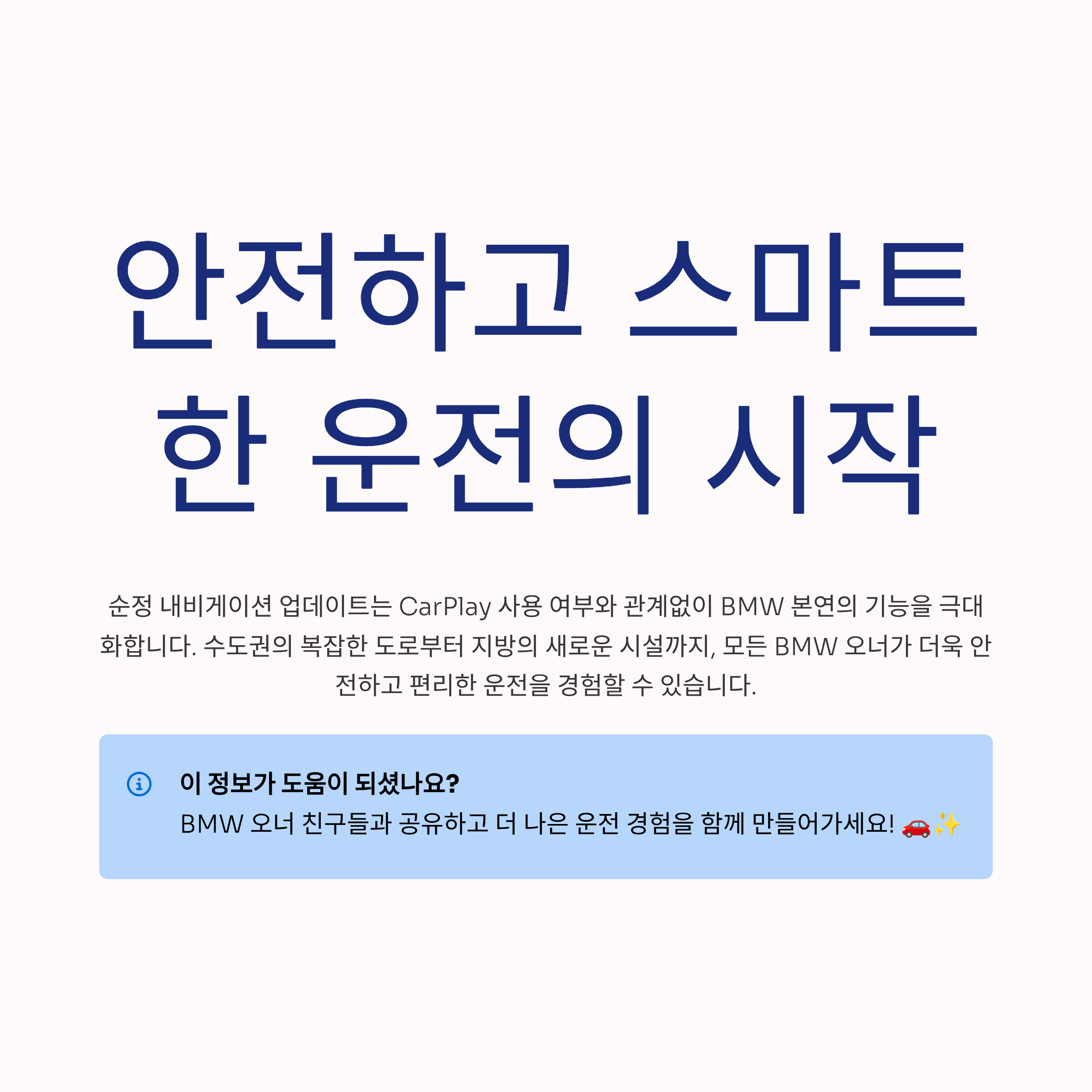 순정 내비게이션 업데이트는 CarPlay 사용 여부와 관계없이 순정 내비게이션과 HUD의 기능적 완성도를 높여줍니다. 수도권에서는 복잡한 도로 환경에 대한 정확한 경로 안내에, 지방에서는 신규 도로 및 시설물에 대한 최신 정보 제공에 큰 도움이 됩니다. 이는 안전하고 편리한 운전을 위해 순정 내비게이션의 본래 기능을 극대화하는 중요한 요소입니다.