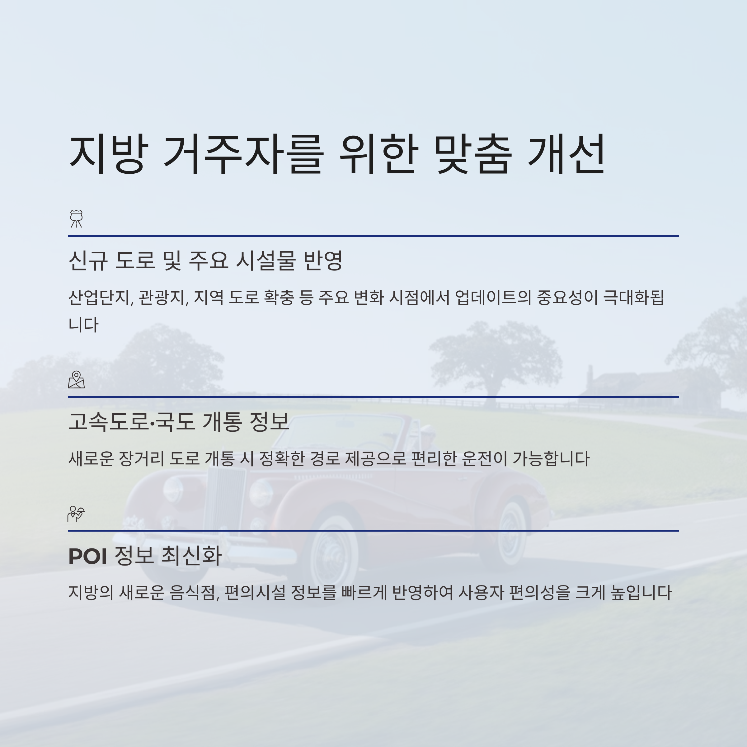 - 주소 및 POI 정보의 최신화: 지방의 경우 새로운 음식점이나 편의시설 등의 정보가 지도에 늦게 반영되는 경우가 많습니다. 꾸준한 업데이트는 이러한 최신 POI를 빠르게 제공하여 사용자 편의성을 높입니다.