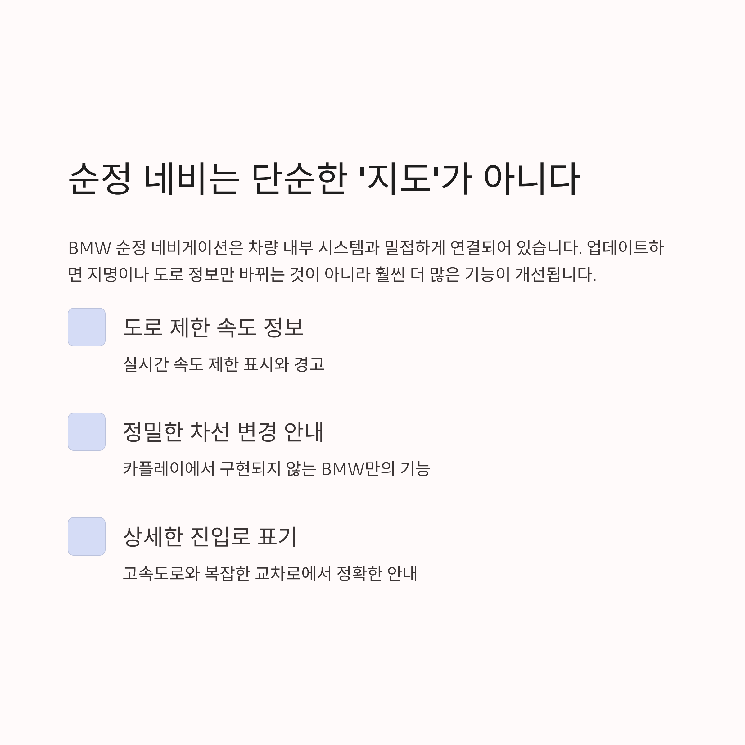 BMW 차량을 운전하면서 대부분 카플레이(Apple CarPlay)만 사용하는 운전자라면, 순정 네비게이션 업데이트는 불필요하다고 느낄 수 있습니다. 하지만 BMW ID6, ID7 시스템의 네비 업데이트는 단순히 '지도만 바꾸는 일'이 아닙니다. 최신 경로 정보 외에도 차량 전반적인 주행 경험, 인포테인먼트 시스템 안정성, 교통 정보 처리 방식까지 달라지기 때문에 무조건 해두는 게 유리합니다.