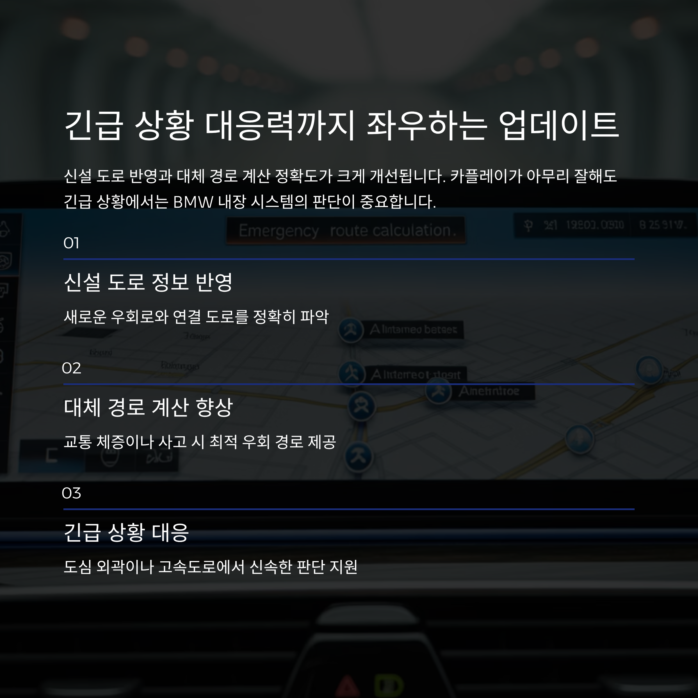 특히 도심 외곽이나 고속도로에서 급한 판단이 필요한 상황이라면 BMW 내장 네비가 최신이어야만 정확하게 대응이 가능합니다.