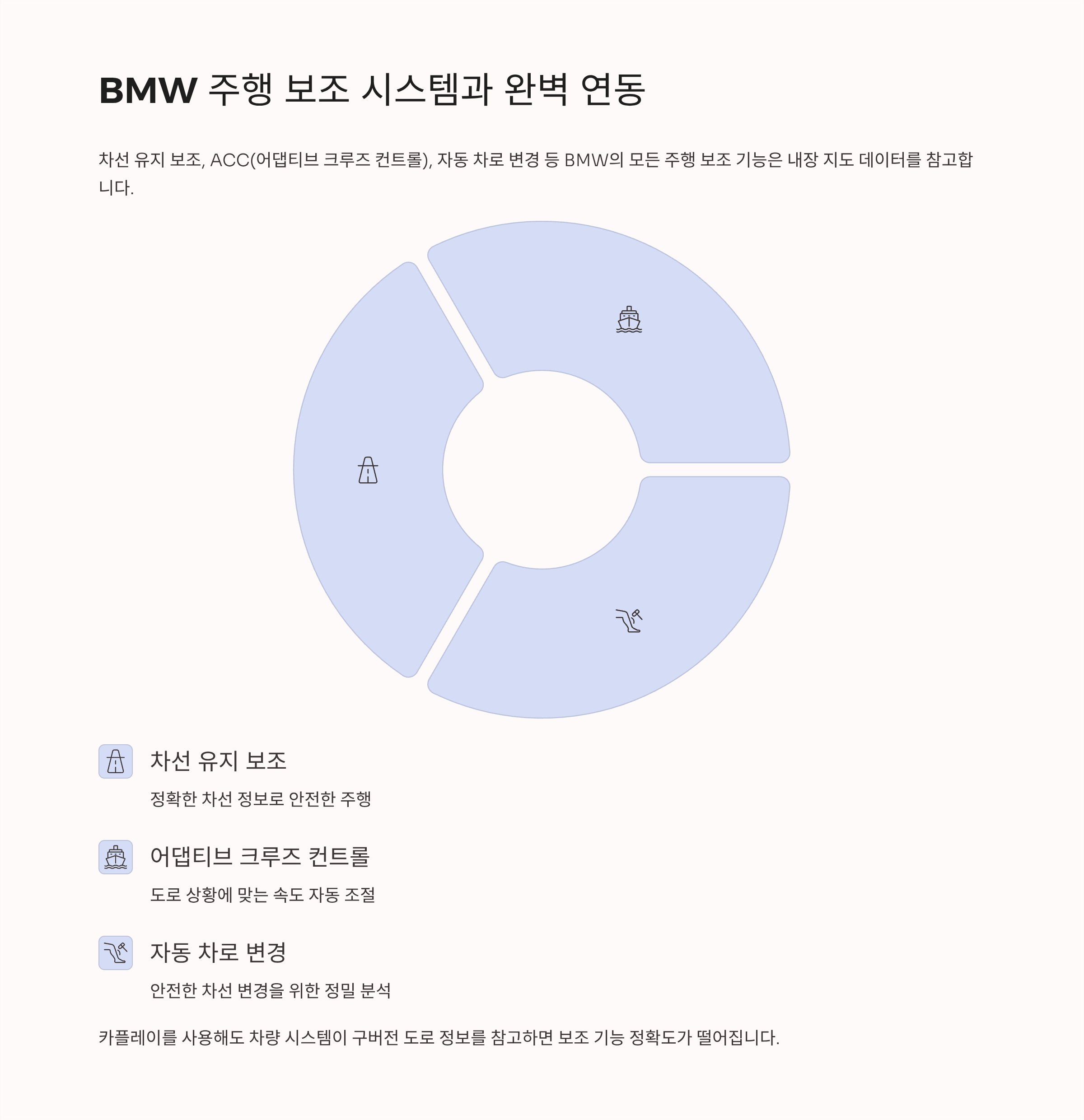 BMW의 차선 유지 보조, ACC(어댑티브 크루즈 컨트롤), 자동 차로 변경 등의 기능은 모두 내장 지도 데이터를 참고합니다.