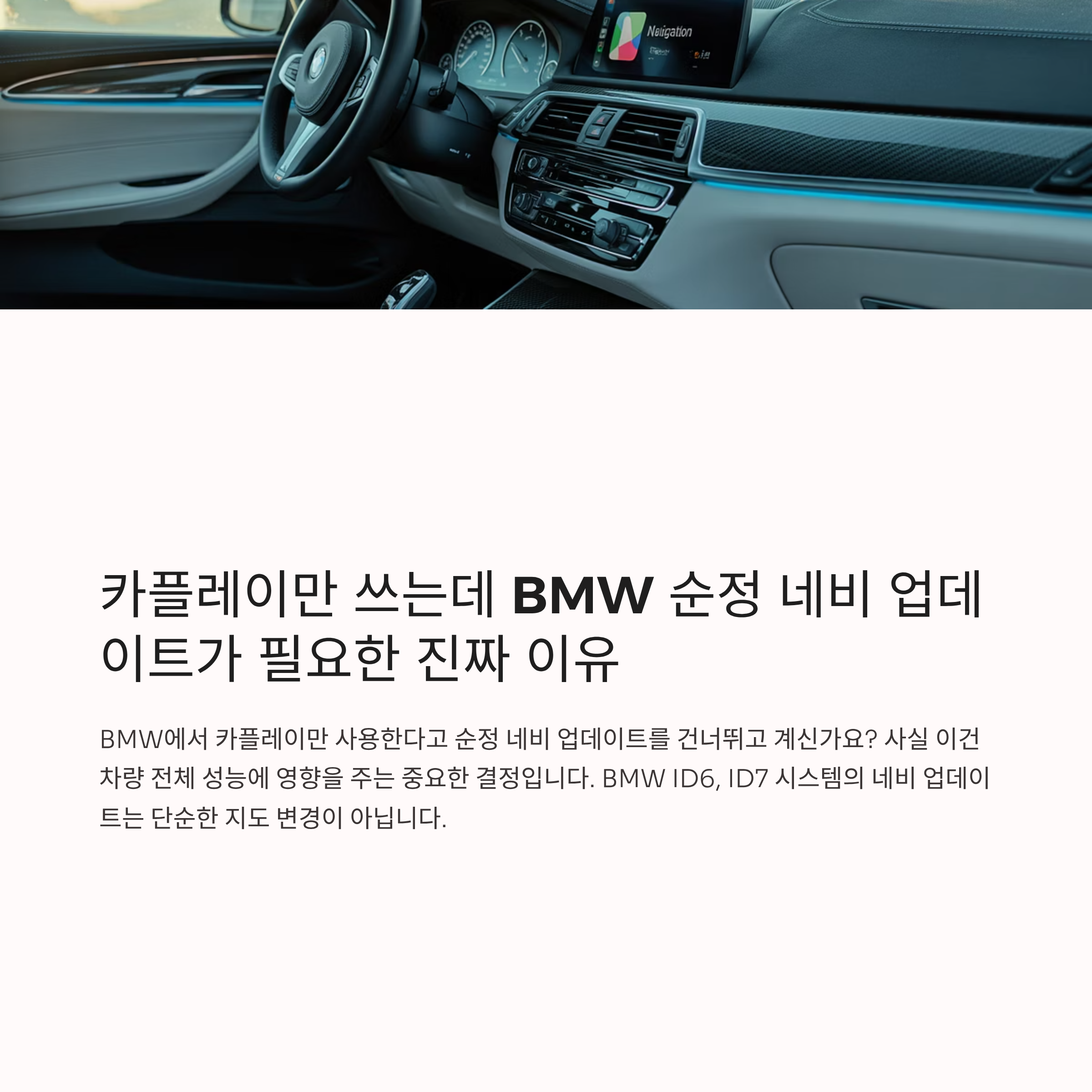 BMW 차량을 운전하면서 대부분 카플레이(Apple CarPlay)만 사용하는 운전자라면, 순정 네비게이션 업데이트는 불필요하다고 느낄 수 있습니다. 하지만 BMW ID6, ID7 시스템의 네비 업데이트는 단순히 '지도만 바꾸는 일'이 아닙니다. 최신 경로 정보 외에도 차량 전반적인 주행 경험, 인포테인먼트 시스템 안정성, 교통 정보 처리 방식까지 달라지기 때문에 무조건 해두는 게 유리합니다.