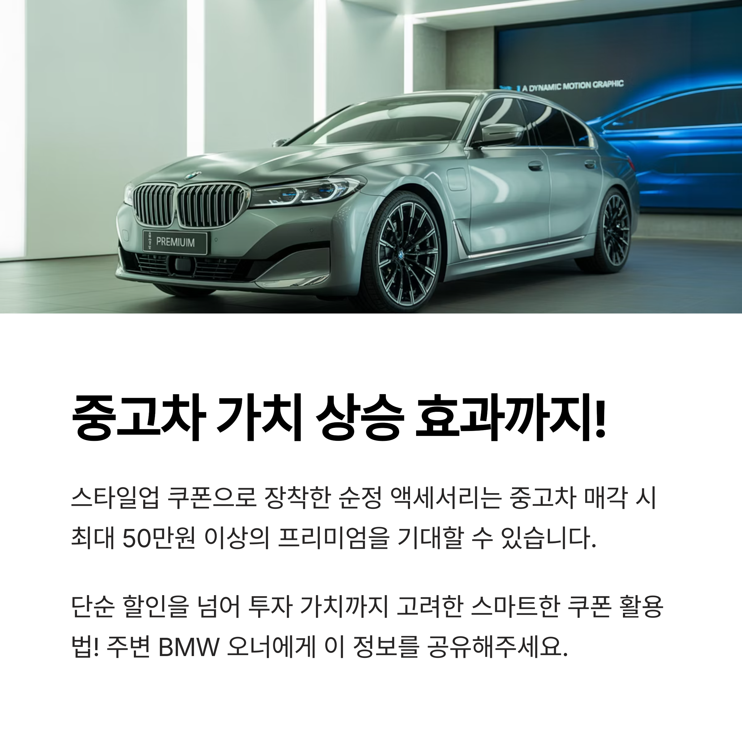 BMW 차량을 구매하면 제공되는 스타일업 쿠폰은 단순한 사은품이 아닙니다. 순정 액세서리 및 라이프스타일 제품을 최대 30%까지 할인된 가격에 구매할 수 있는 매우 강력한 혜택인데요. 사용 시기, 품목 선택, 딜러와의 협의 전략에 따라 실제 체감 할인율이 크게 달라집니다. 이 글에서는 스타일업 쿠폰의 정확한 할인율 정보와 효율적인 활용법을 중심으로 꼼꼼하게 정리해드립니다.
