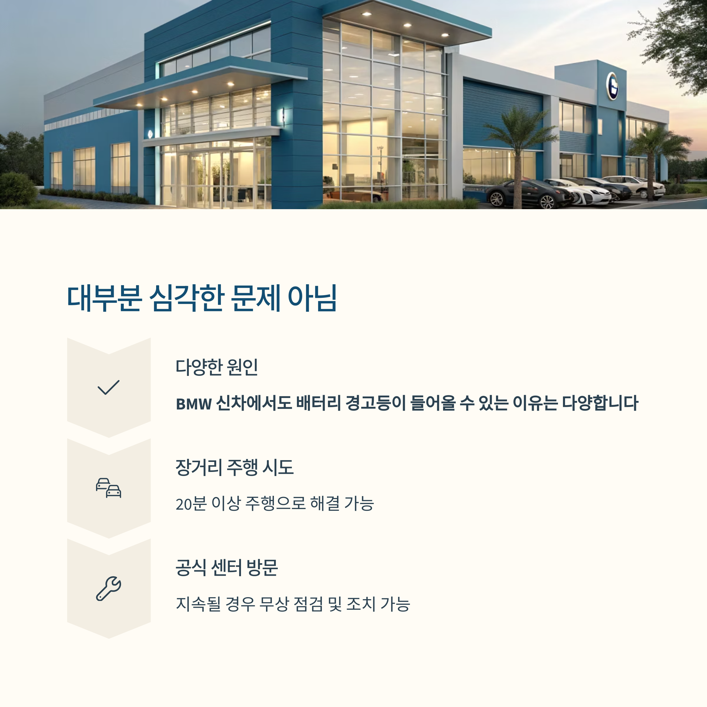 이 글에서는 BMW 신차의 배터리 경고등이 들어오는 원인과 해결 방법을 상세히 안내드립니다.