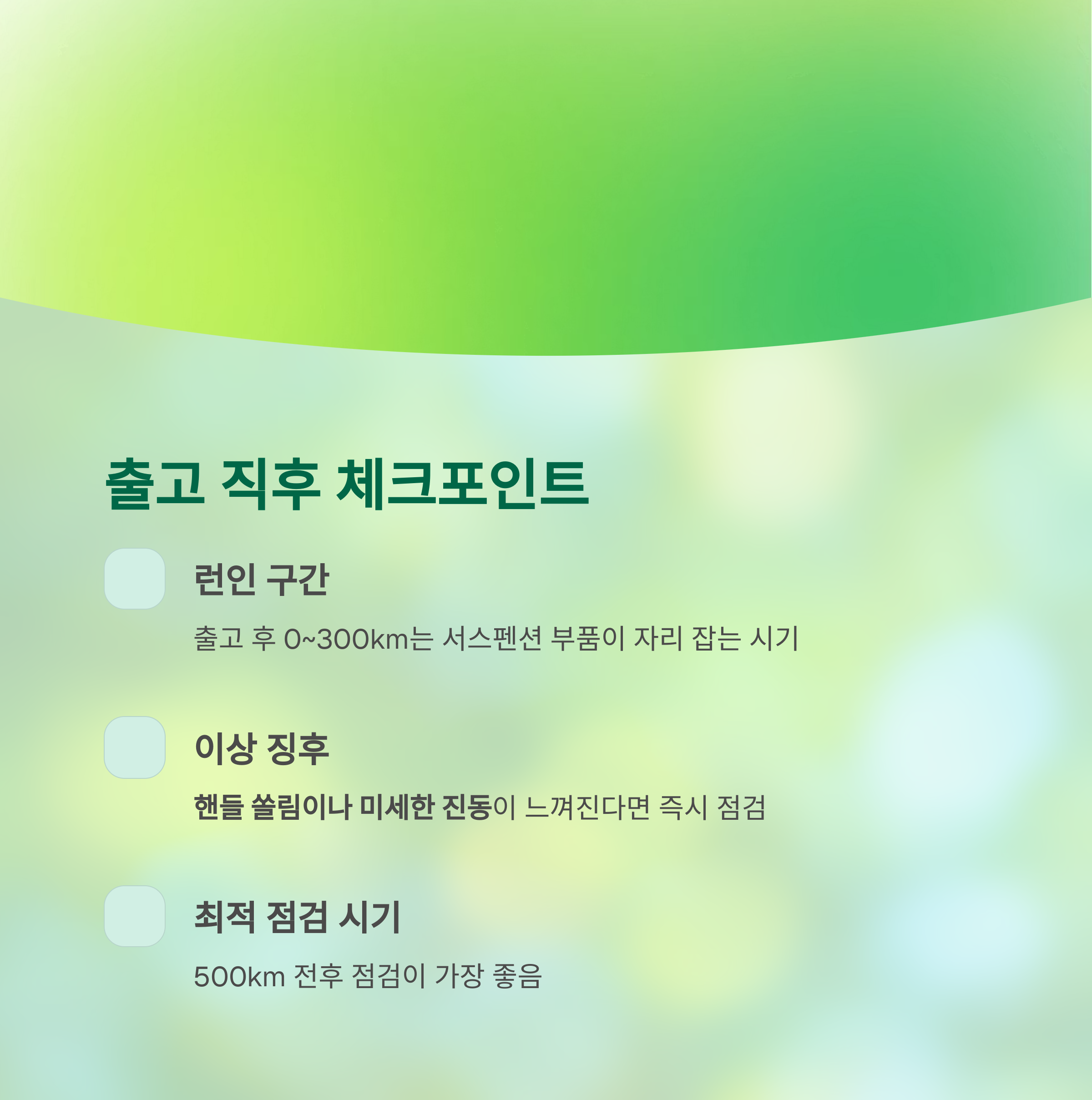 | 출고 직후 (0~500km) | 기본 점검 권장 |