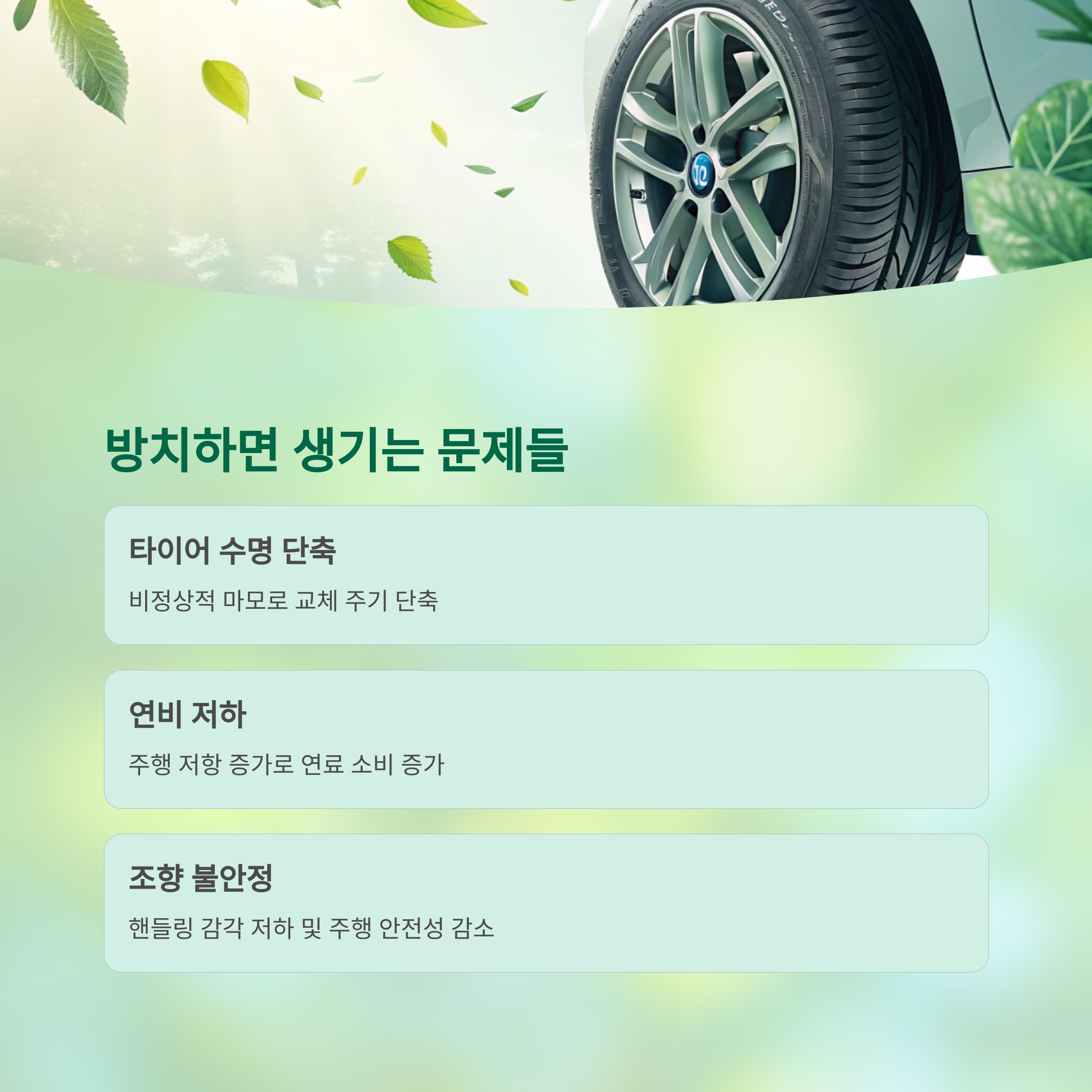 타이어 수명 단축, 연비 저하, 조향 불안정까지 발생합니다.
