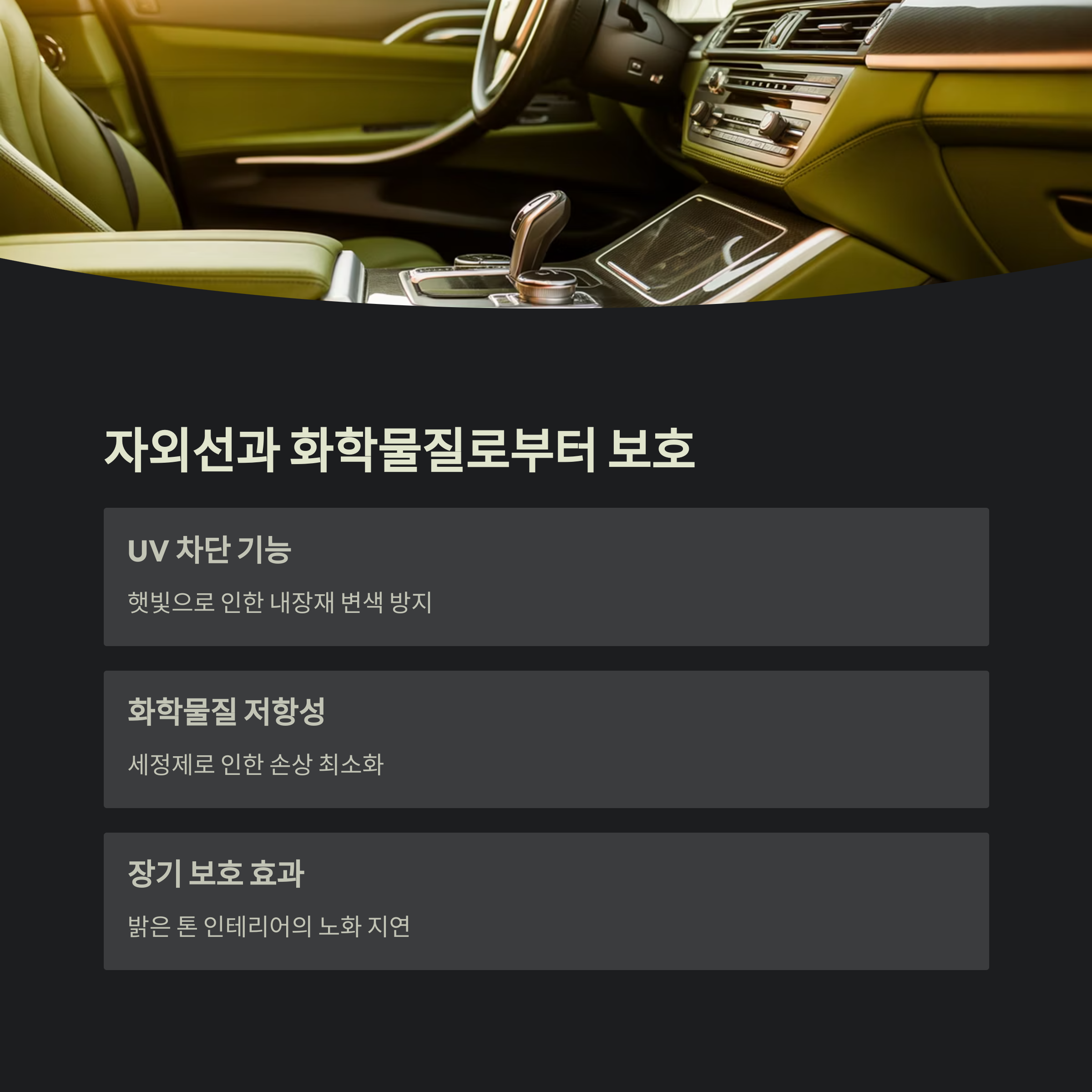 PPF는 자외선 차단 기능과 화학물질 저항성을 동시에 갖추고 있어 내부 자재의 노화를 늦춰줍니다.