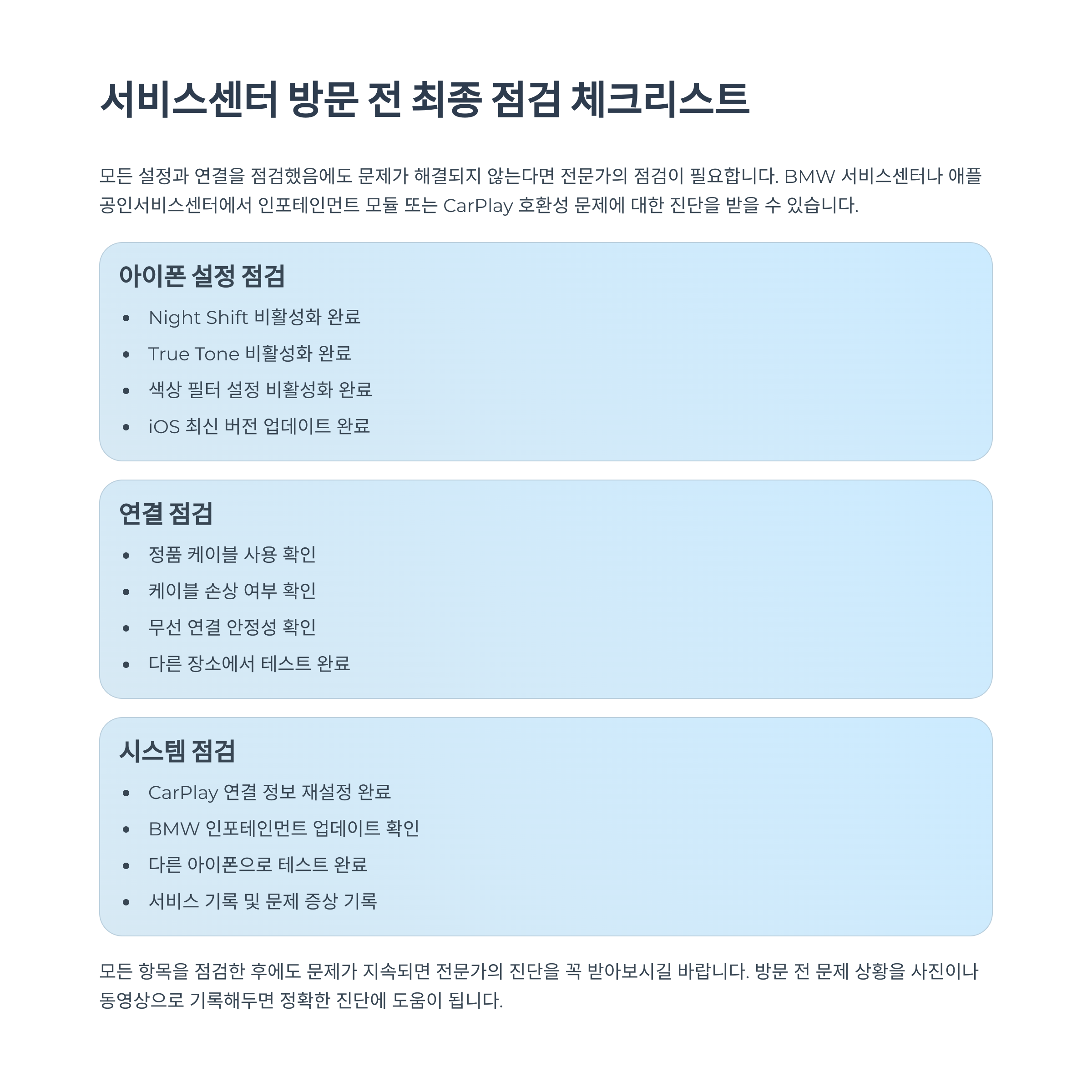 업데이트 후에도 문제가 지속된다면, Apple 공식 포럼이나 BMW 기술지원을