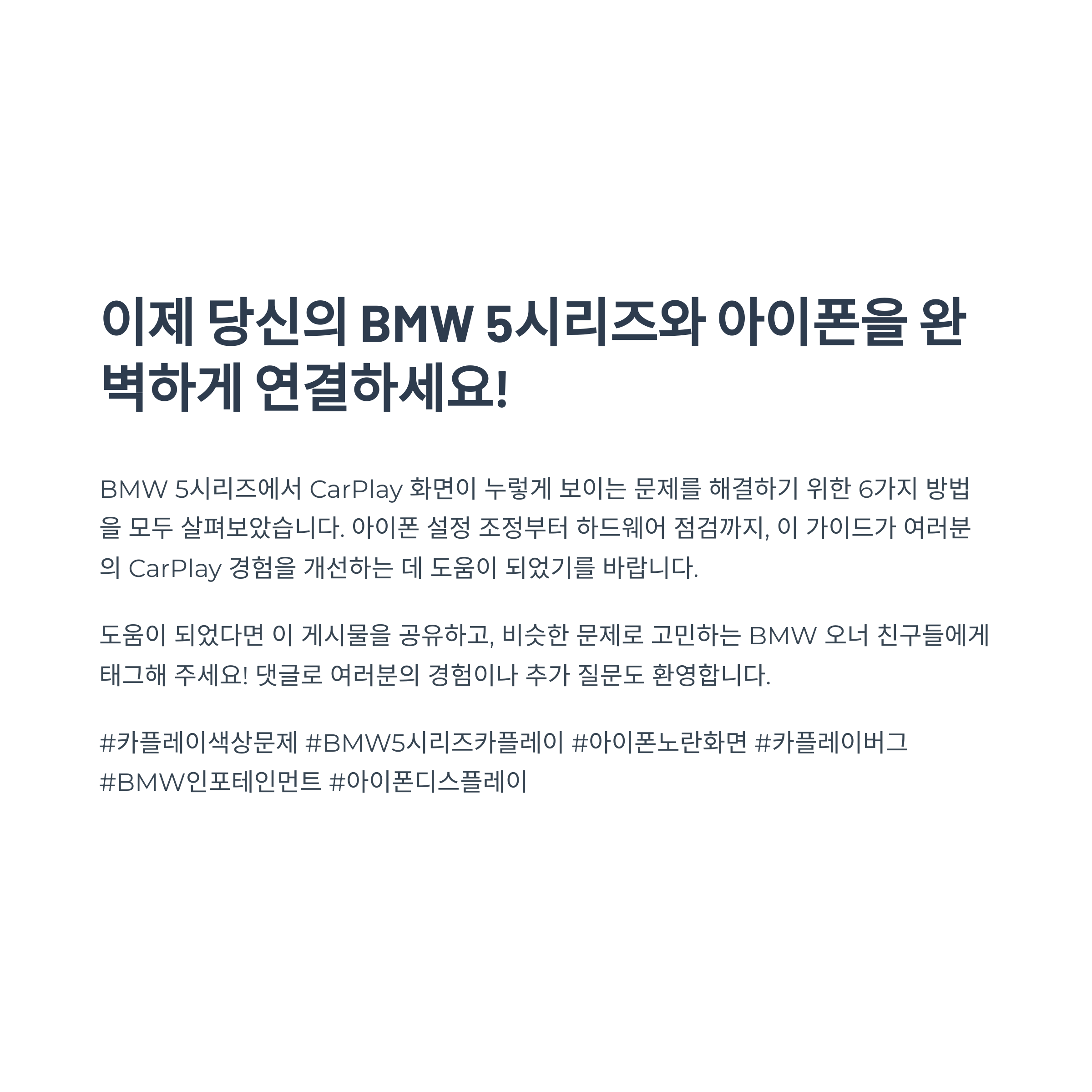 CarPlay 호환성 이슈는 소프트웨어 버전 차이에서 발생할 수 있습니다. iOS 또는 BMW
