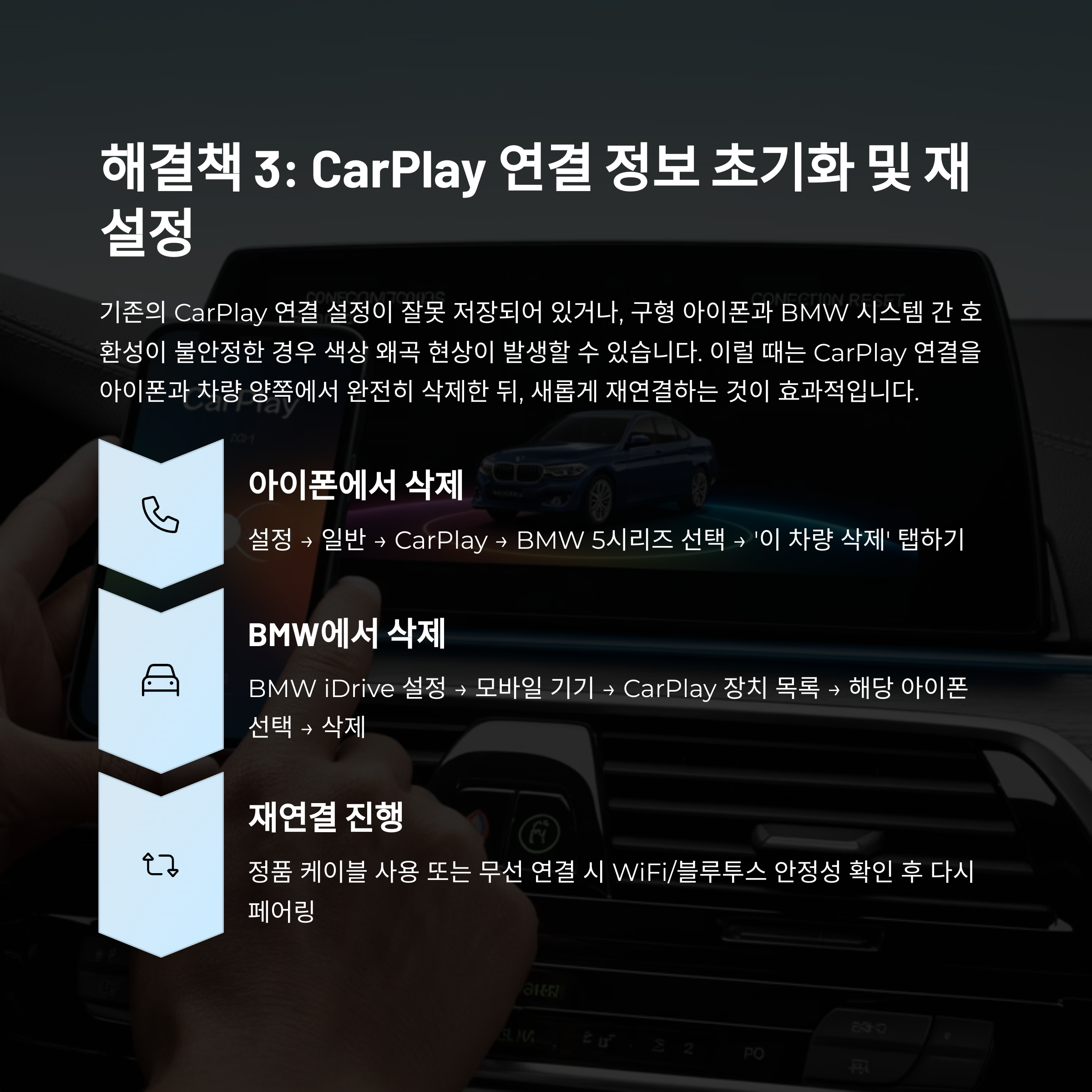 기존의 CarPlay 연결 설정이 잘못 저장되어 있거나, 구형 아이폰과 BMW 시스템 간